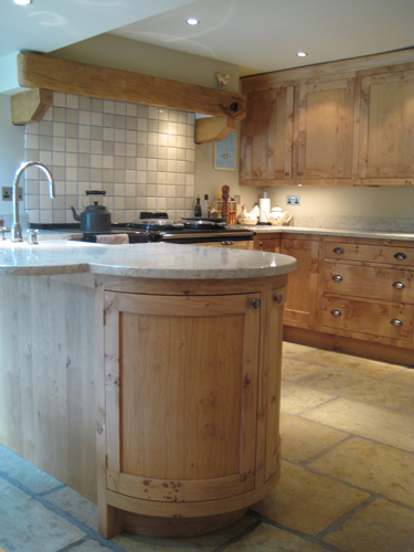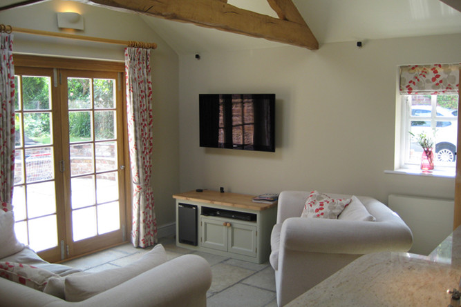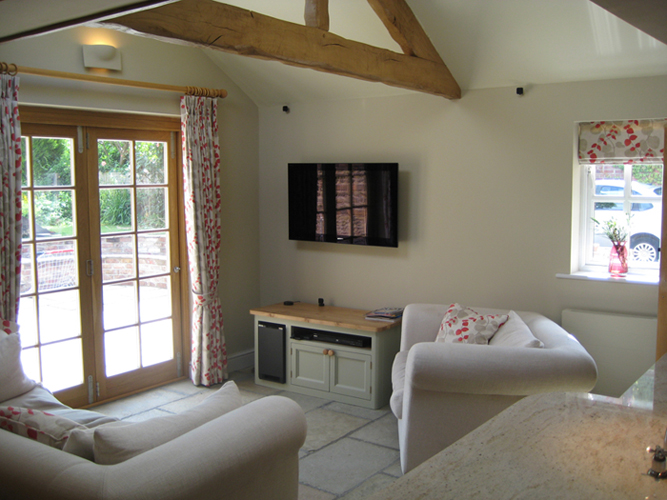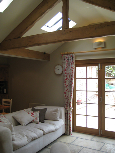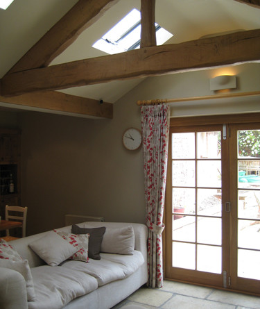 A new single-storey extension was added with complimentary materials and detailing. Four new steel beams were inserted to create a large open-plan space. One of the existing doorways was turned into a bookcase allowing a new efficient U-shaped kitchen to be installed with a larger four oven Aga. Bespoke oak cabinets were manufactured by Chapel Kitchens of Nun Monkton along with a matching bench and dining table. Two ‘conservation’ rooflights ensure natural light fills the new garden room. An oak sliding/folding door was manufactured to match the existing windows and provide level access to the redesigned garden.