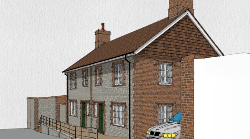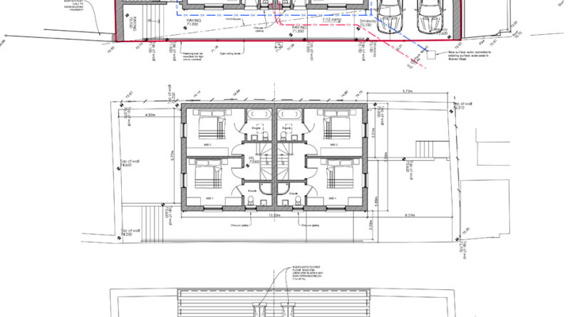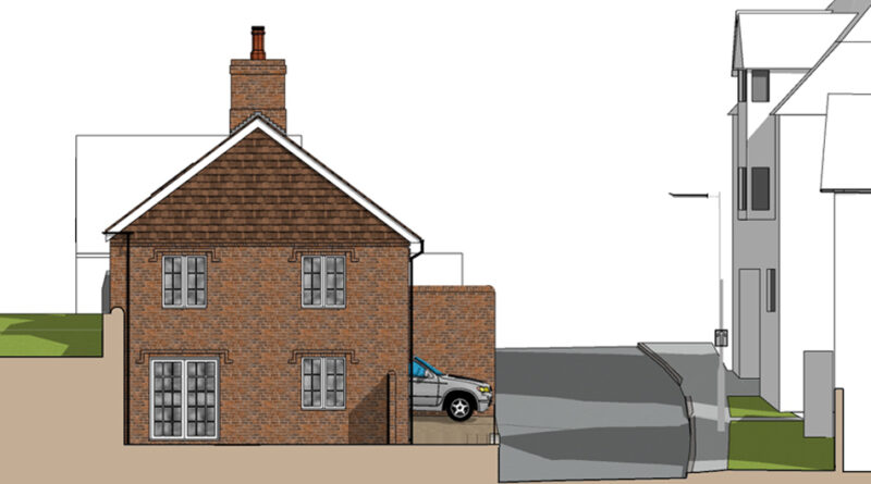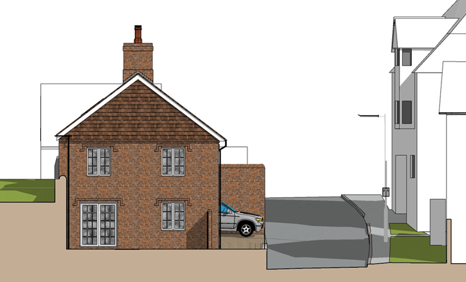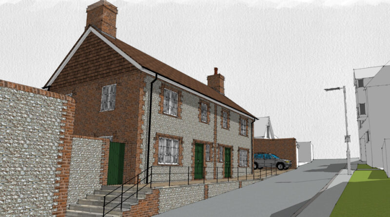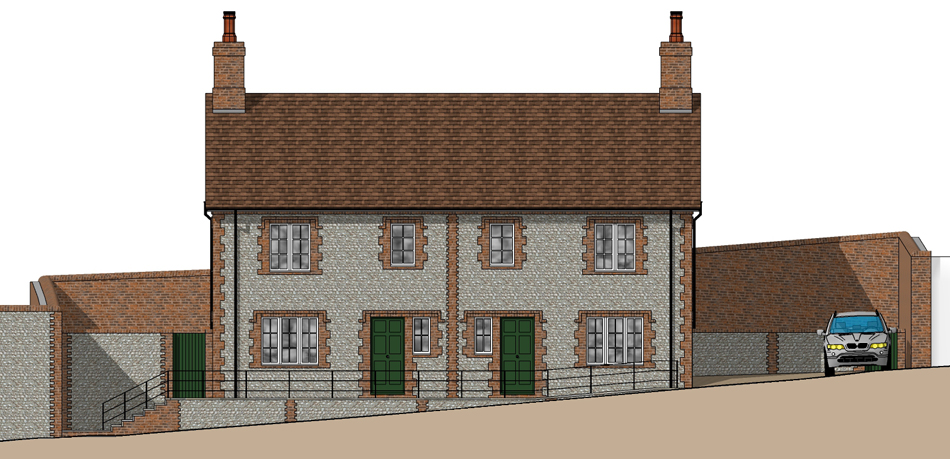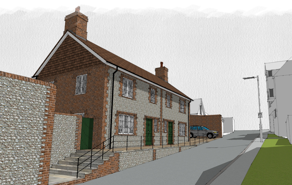 The site was to be ‘created’ by removing a section of a locally listed flint and brick wall and excavating the 4m height of earth behind this wall to form a site level with the road. A new brick faced retaining wall to the rear of the site (and forming the rear walls of the houses) would ensure that the earth behind was kept in place.