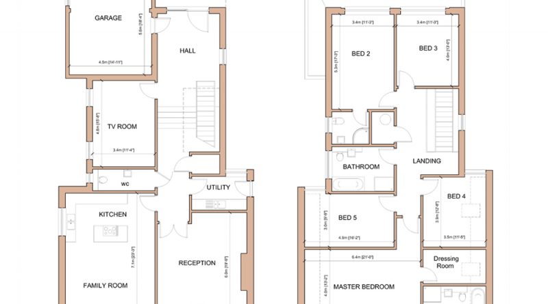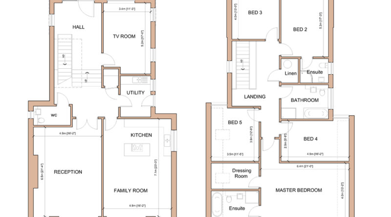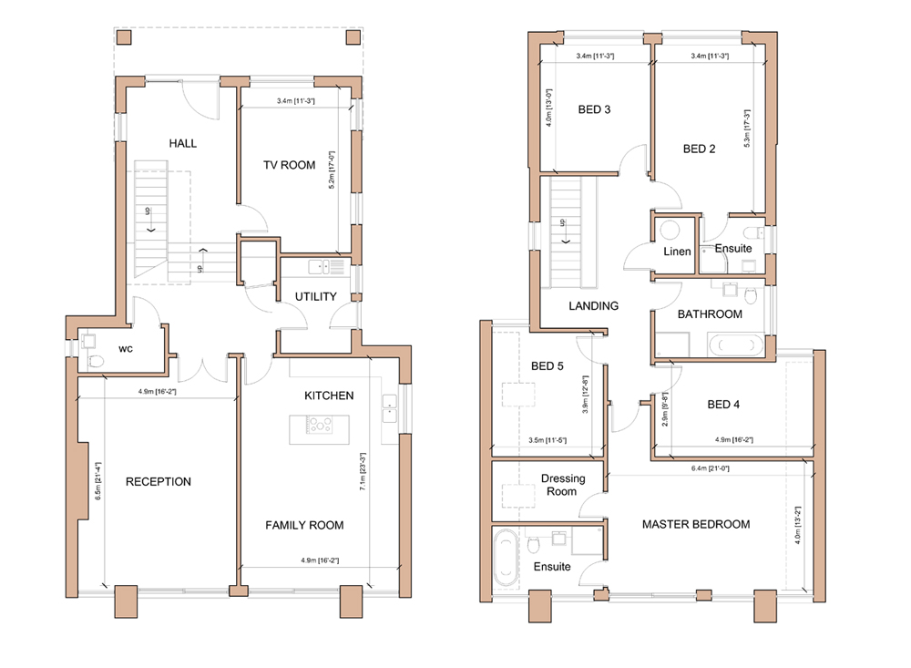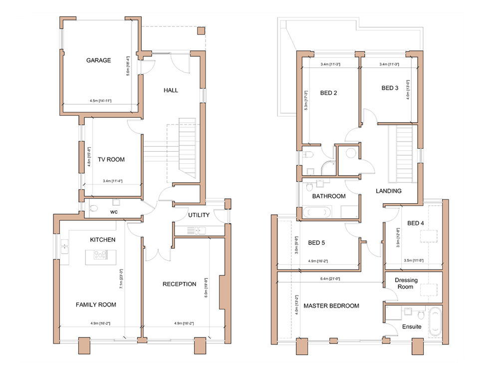 Overlooking open rolling countryside to the south, these five bedroom 3,000sqft+ homes have been designed over two floors with a stepped ground floor taking advantage of the natural topography of the site. This provides extra high ceilings to the main reception and living spaces at the rear of the house where the large glazed southern elevation allows light to flood into the interior.
