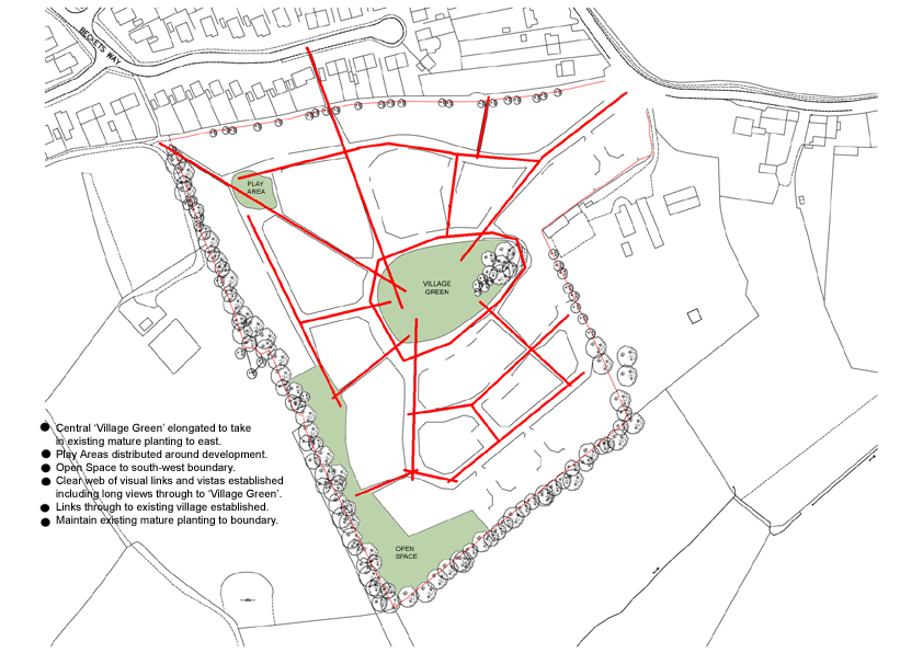 A new ‘village green’ is established in the centre of the development giving equal access to all plots. Radiating from this are a series of views and vistas along which pedestrian routes are set out.