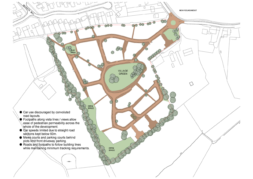 Road layouts are deliberately convoluted with straight sections kept to a maximum of 60m to maintain speeds below 30mph. Mews areas and rear parking courts also take the emphasis away from front garden parking areas. Road and footpaths follow the building lines, while meeting the requirements of vehicle tracking, ensuring that the spaces created relate to the buildings and not the needs of the motor car.