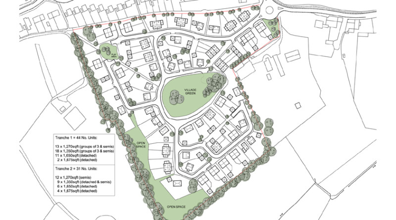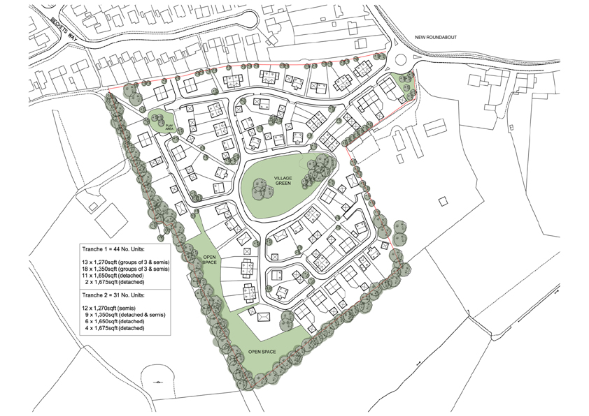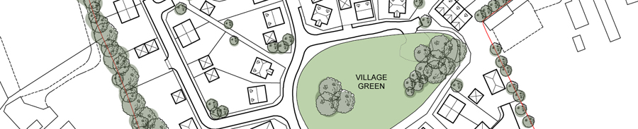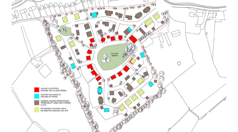Larger houses are clustered around the green, facing onto it, with smaller houses evenly distributed around the site together with affordable homes.
