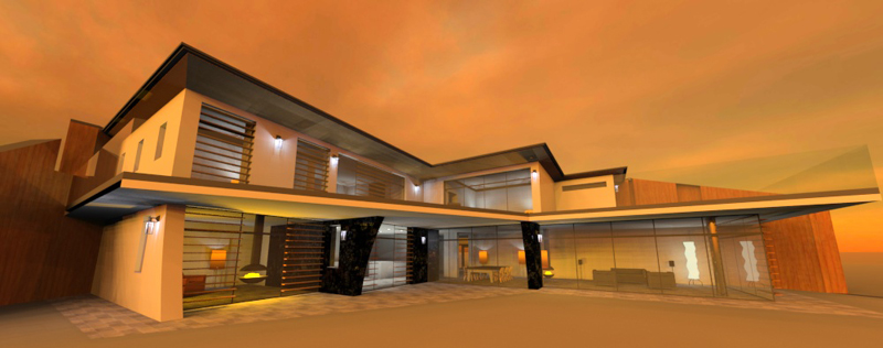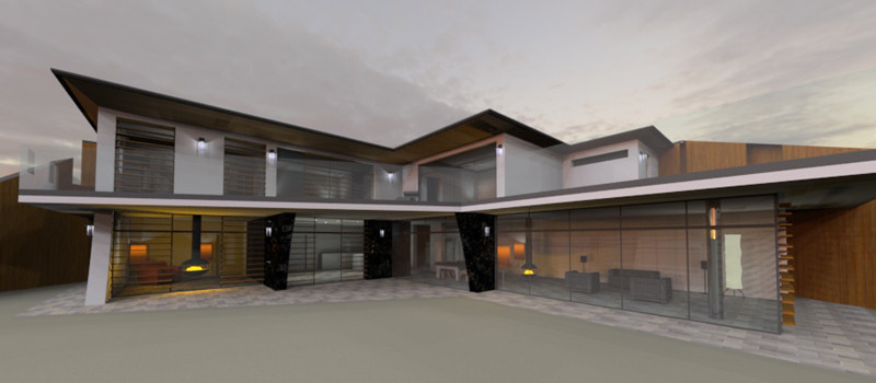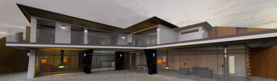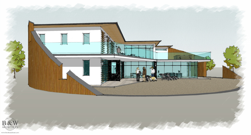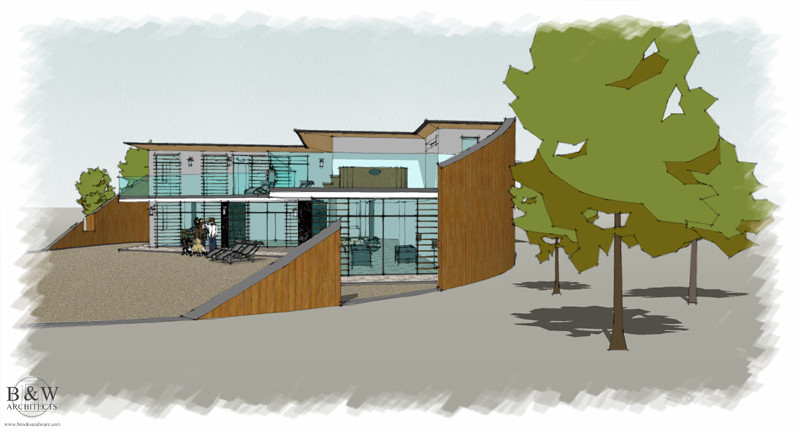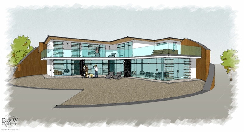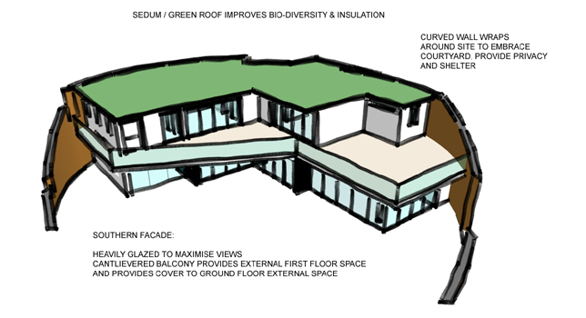Designed around the concept of two interlocking and overlapping curved timber walls to the north side and open, glazed elevations to the south elevation this Contemporary new home incorporates many passive environmentally beneficial ideas including the ‘green’ sedum planted roof, smaller openings through a well insulated north facing façade, deep overhanging roofs and the cantilevered balcony to the south elevation protecting the interior from excessive solar gain in summer while allowing the low winter sun to penetrate deep into the building. Wood burning suspended stoves in the principal reception space and snug supplement ground source heat pump underfloor heating.