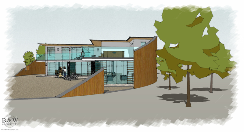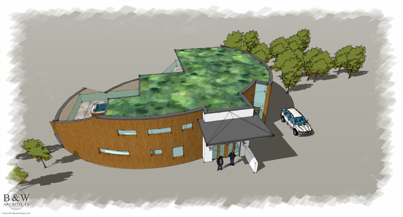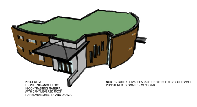 The curved walls are formed as a two storey timber ‘palisade’ wall and have only slot windows (horizontal and vertical) set within deep reveals. This curving façade and absence of visible roof from the front reduces the visual impact of the building within it’s heavily planted site. The vertical boarding, from locally sourced sweet chestnut coppices, would weather naturally to allow the building to further blend into its site.