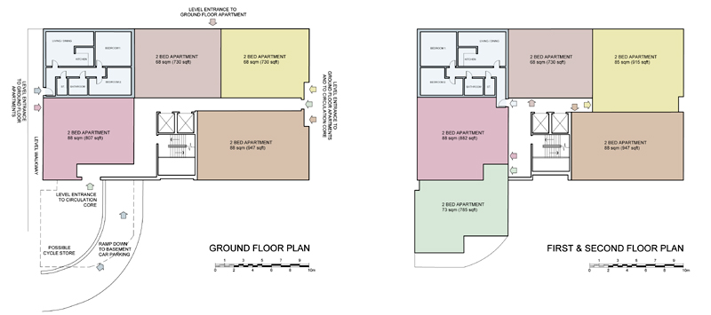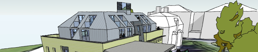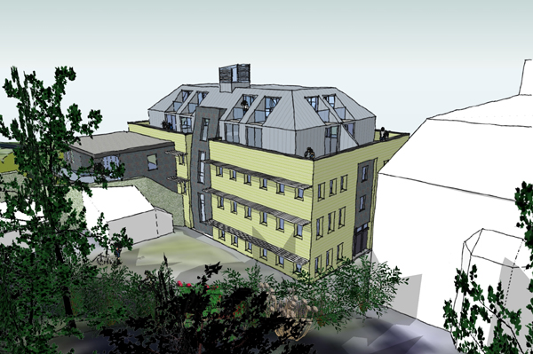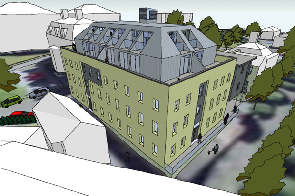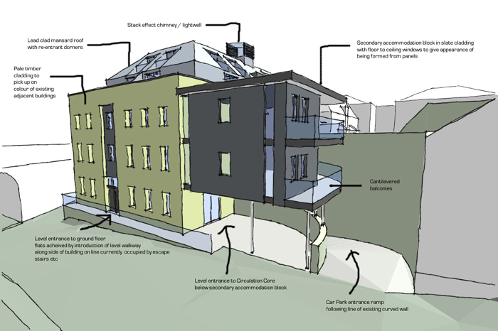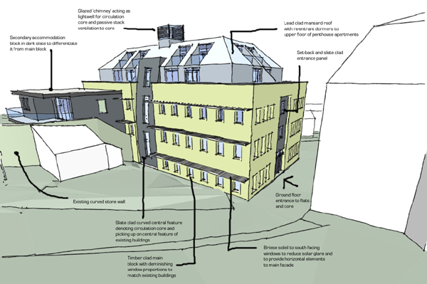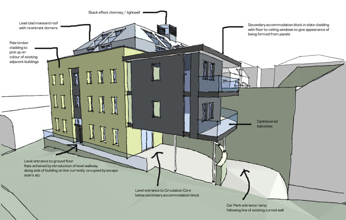 Roofs are either slated or tiled and are generally hipped or mansard to the larger buildings to keep the overall roof form less imposing. The proposed mansard roof form is to be clad in sheet leadwork to provide a contrasting dark roof. The new building is proposed to have a central circulation core giving access to all the apartments above ground floor level. This circulation core with be topped with a glazed and louvred ‘chimney’ which will provide additional natural light to the central core but also aid natural ventilation through stack effect with warm air rising and fresh air being drawn in to the lower levels.