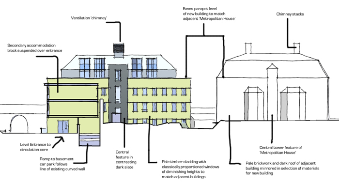 An analysis of the site and existing surroundings and buildings has been carried out to determine what approach should be taken to the design of the new building in terms of massing, materials, proportions etc. The following observations have been made and are reflected in the design of the proposed building; In general the surrounding buildings (and indeed the existing Old dispensary Building being replaced) take the form of large single blocks, often with roofs hidden behind parapet eaves. The blocks are broken up and sub-divided by the use of symmetrically placed central vertical features and horizontal banding details.