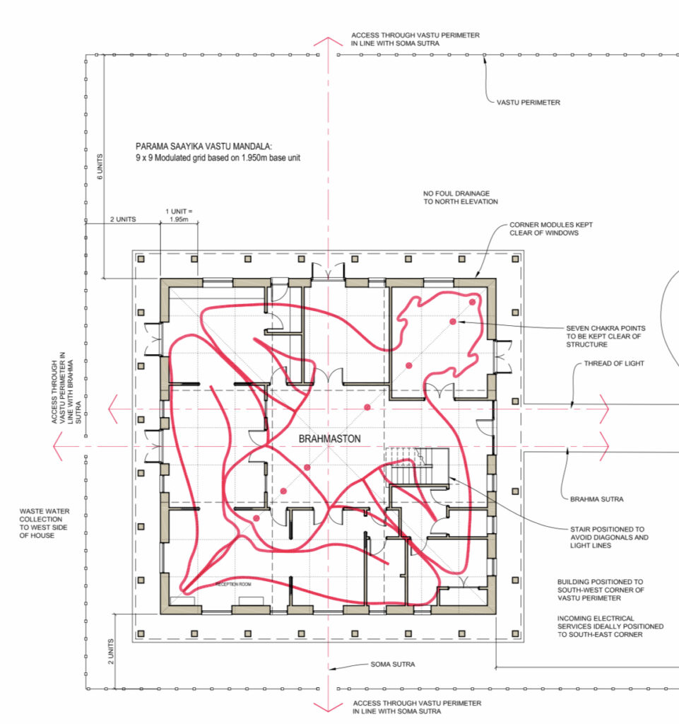 A 9×9 grid, completely square footprint, large two-storey central atrium, clear lines of sight through critical parts of the building, rules defining everything from chakra points, stair positions, toilet orientation, bed directions, percentages of window to wall opening (different on different parts of the building!), incoming services positions etc etc have meant careful planning and a host of decisions which have resulted in a clear floor plan.