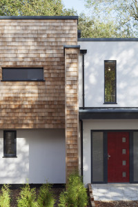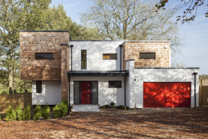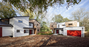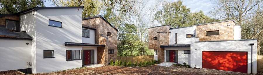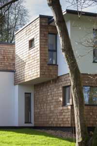 The use of additional insulation, tight air-leakage limits, whole house ventilation with heat recovery, photovoltaic panels and wood burning stoves with LED lighting throughout will mean that the energy usage of these buildings is kept to a minimum. Cedar shingles and rainwater harvesting utilising the space below the ground floor slabs add to the environmental credentials of these houses. As the cedar shingles weather and silver naturally the sculptural houses will blend further into their woodland setting.