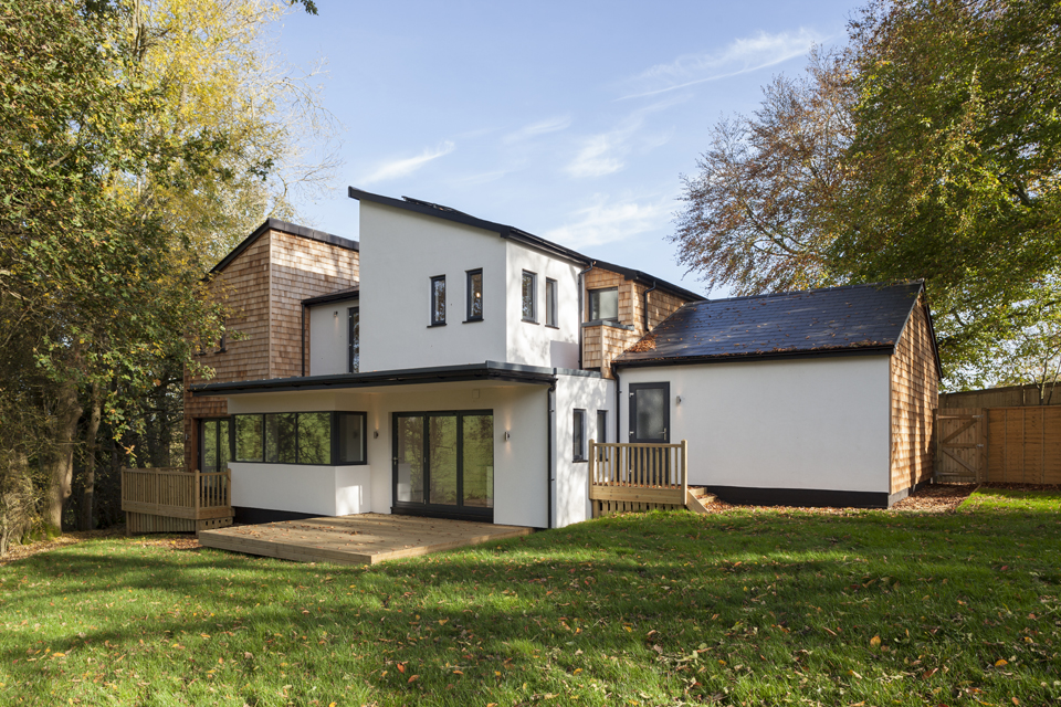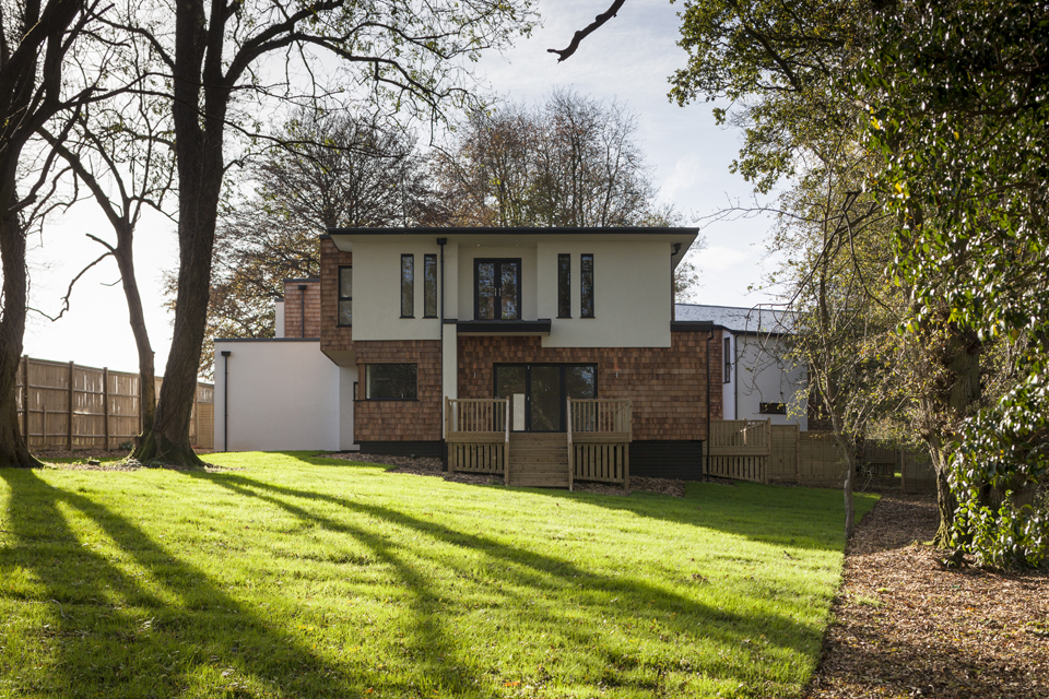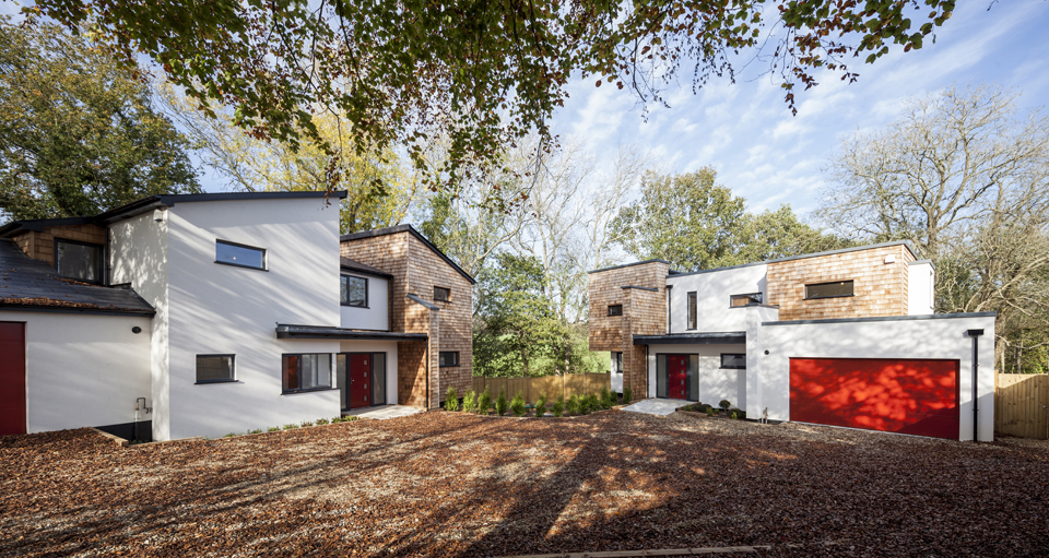 The site in Four Marks, Hampshire, is surrounded by protected trees whose Root Protection Zones cover almost the entire site and dictated both the design form and construction of the foundations of the houses. The gently sloping site coupled with a piled foundation system allowed the suspended ground floor slabs to be lifted out of the ground preventing damage to the roots and ensuring that ground water is still able to get to the roots. The effect is to give the appearance of the houses floating out over the site as the ground falls away.