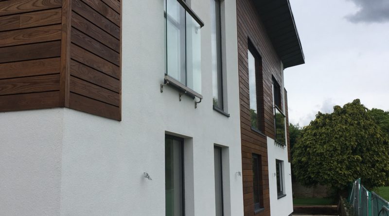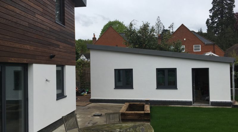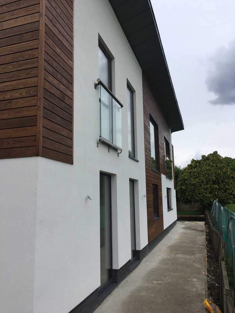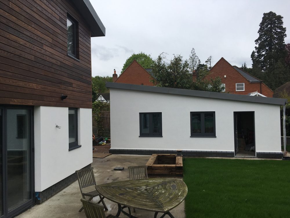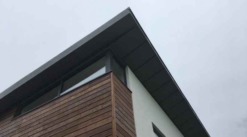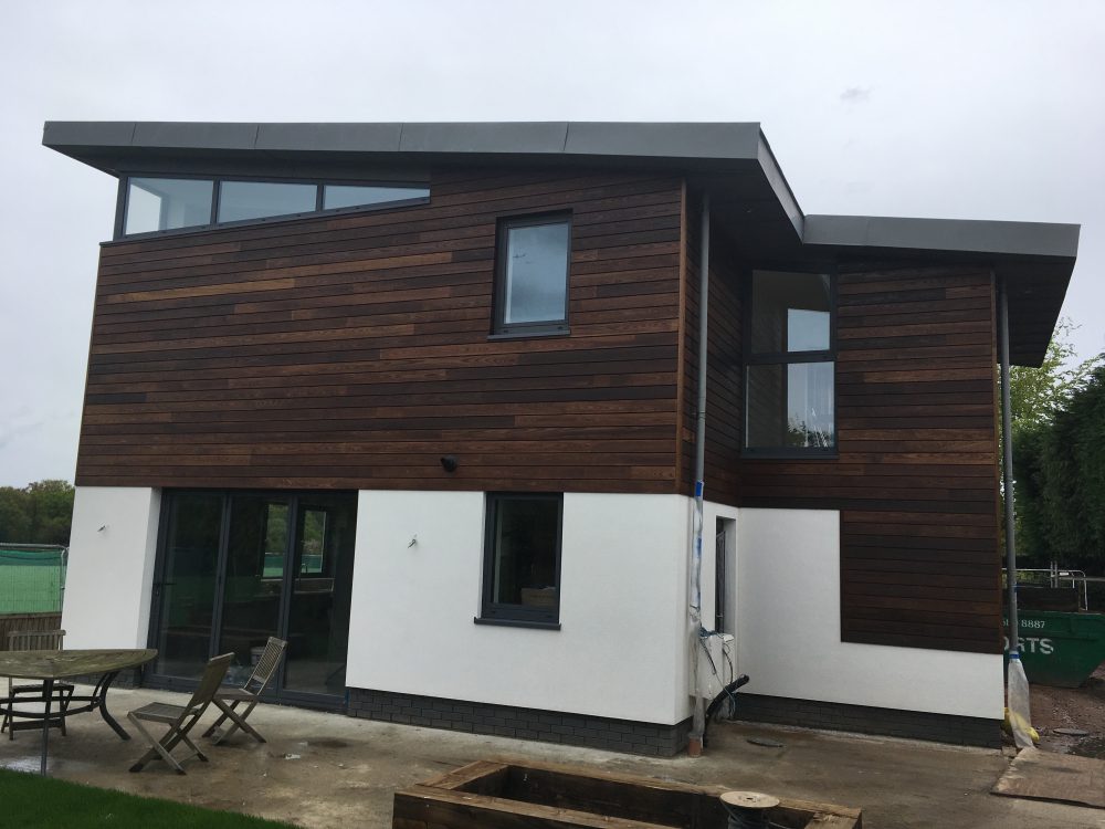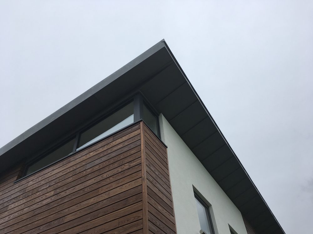 This replacement contemporary dwelling sits in a backland site behind a street of ordinary ‘vernacular’ homes and is accessed down a narrow private drive. Ash Thermood timber cladding over a white render and black brick plinth clad the superstructure by MBC Timberframe. The standing seam zinc roof with concealed guttering and matching zinc rainwater pipes cantilevers over the clerestory glazing.