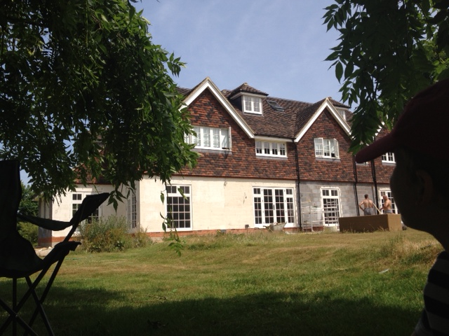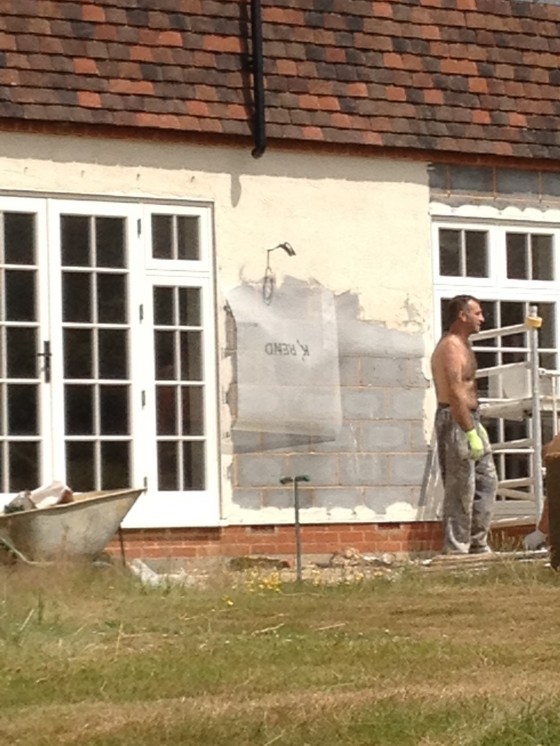 Following several month of painstaking searches, empty promises and rejected samples a contractor capable of producing the finished self-coloured roughcast rendering texture the client required has been found, www.externalrendering.net, and work is finally underway on the the last of the main work items for the remodelling project in Chipstead. The render company are using K-Rend‘s through-coloured silicone proprietary roughcast render system.