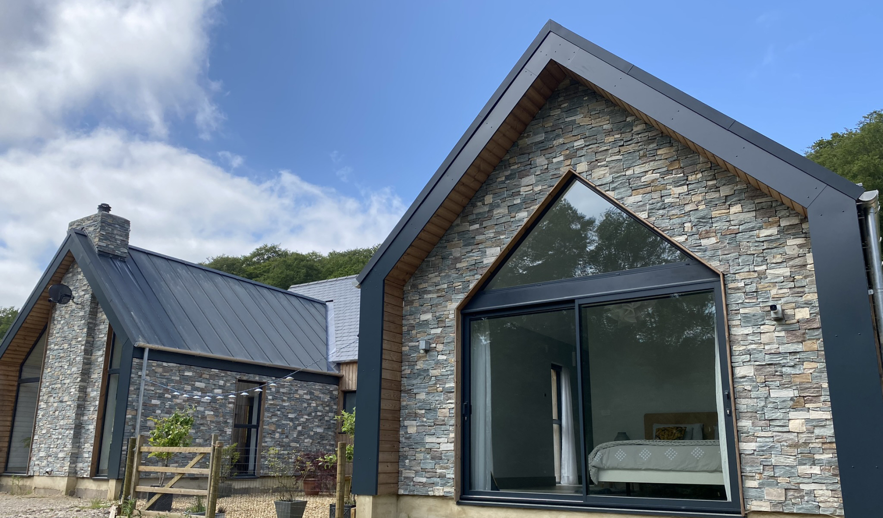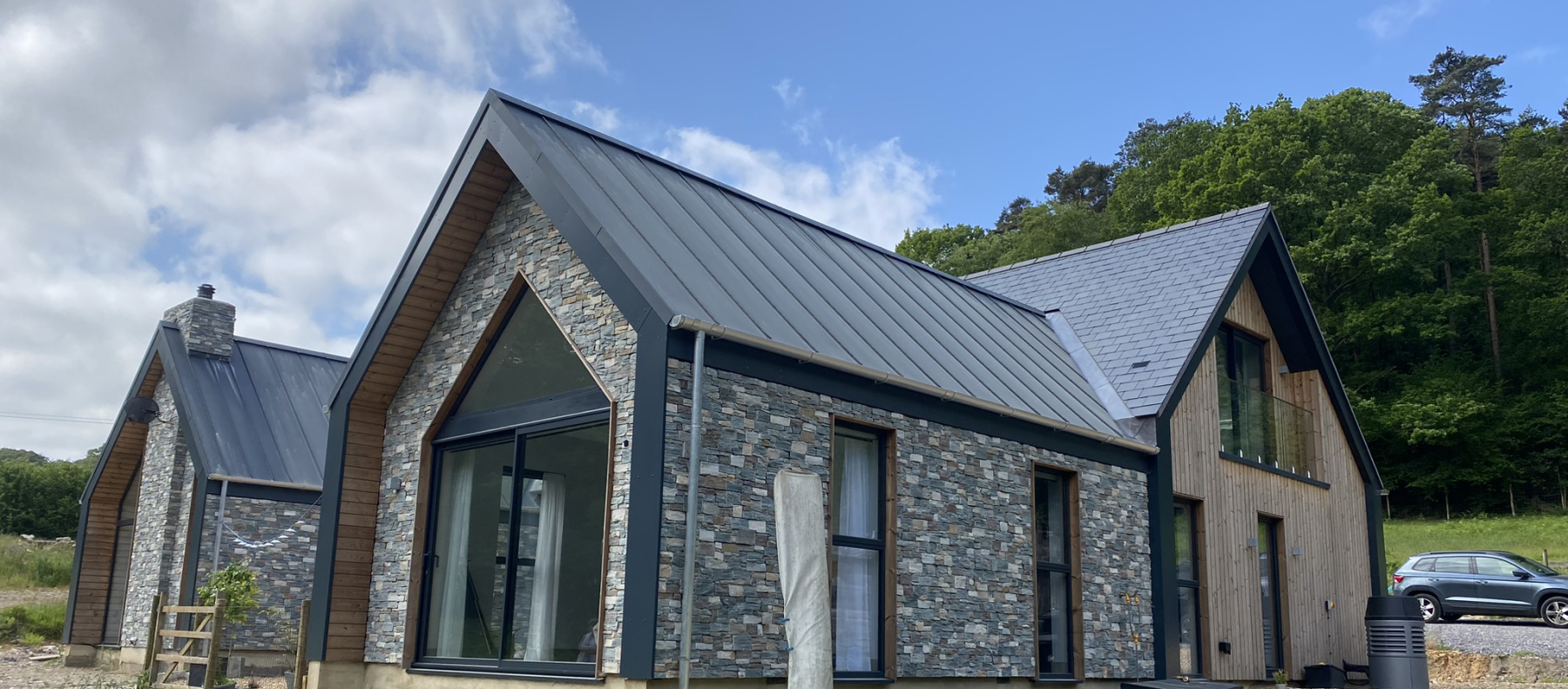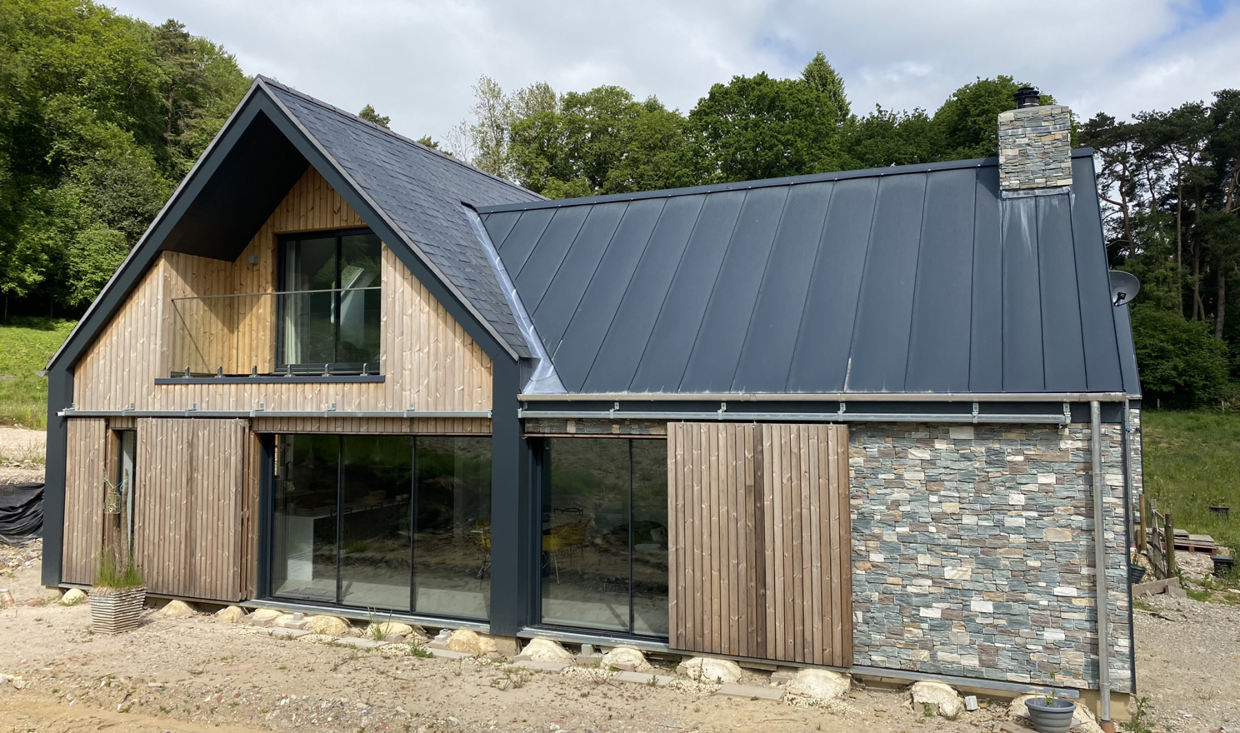 The client’s initial brief was for the new home to have the simple built-form, reminiscent of traditional gable-end and rectangular agricultural barn structures with lower eaves, but with a contemporary aesthetic overall externally and internally. Materials were to be a mix of simple timber cladding and stonework with slate and standing seam metal roofing. The finalised design is for a U-shaped building creating a sheltered courtyard to the rear, looking out over the sloping site and woodland beyond. The wings of the U-shape are single storey and contain the main living space and principal bedroom; both of which are vaulted to give large windows and to take advantage of the simple construction nature of a SIPs build. The building form is expressed on the ends of the two storey and single storey wings with aluminium clad panels from ground level and over the edges of the roof. The single storey elements are stone clad with a zinc standing seam roof, the two storey front section of the bulding is timber clad with slate roof.