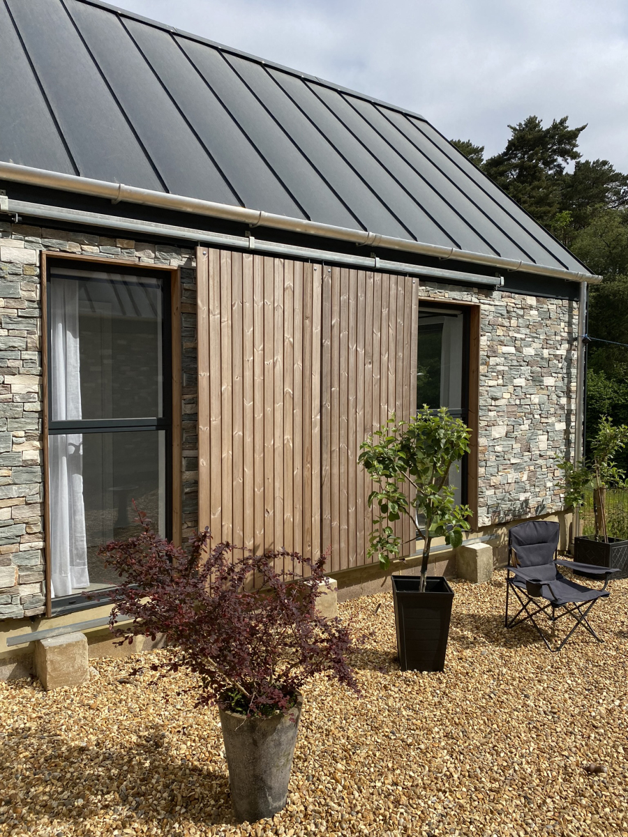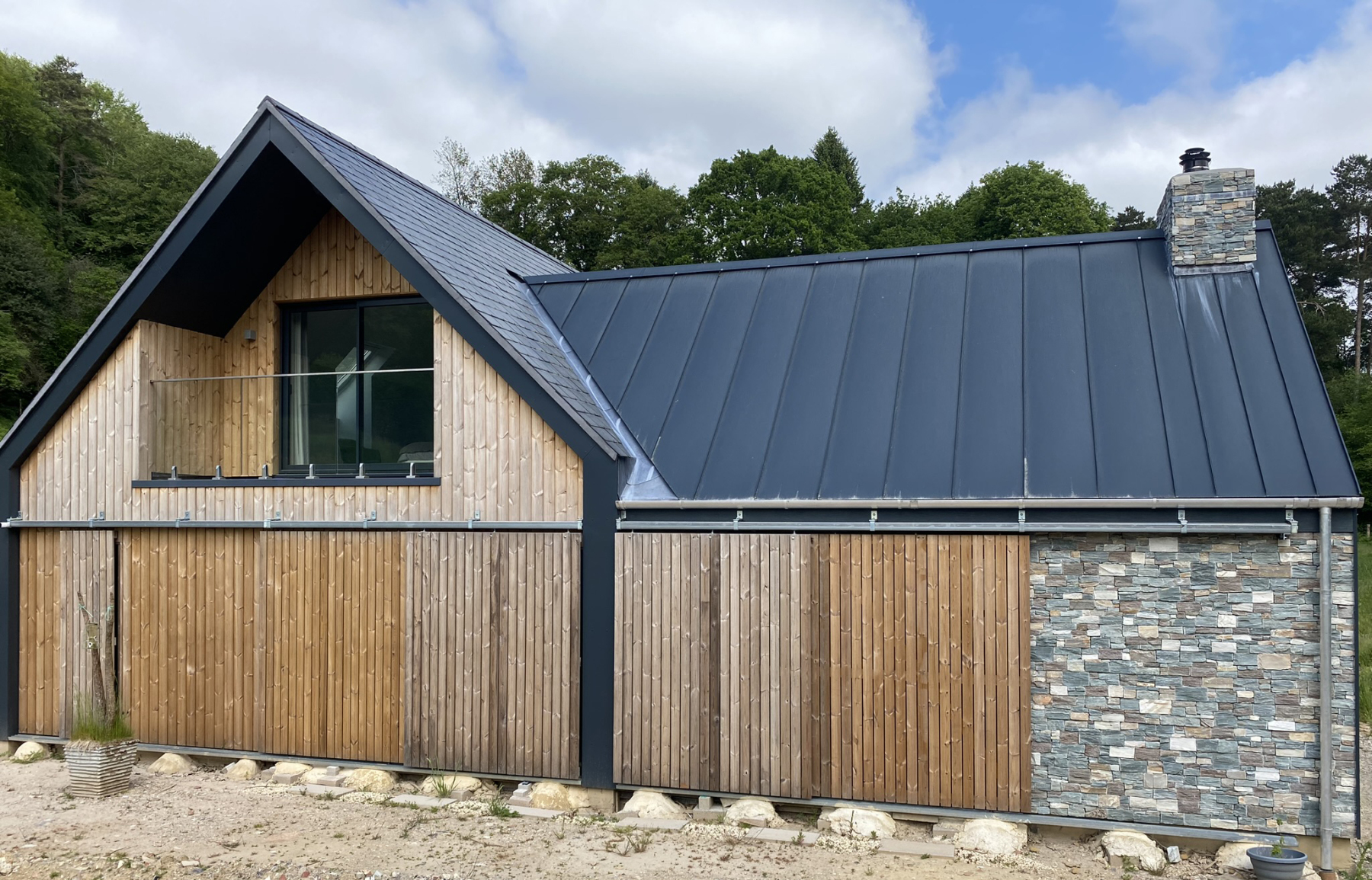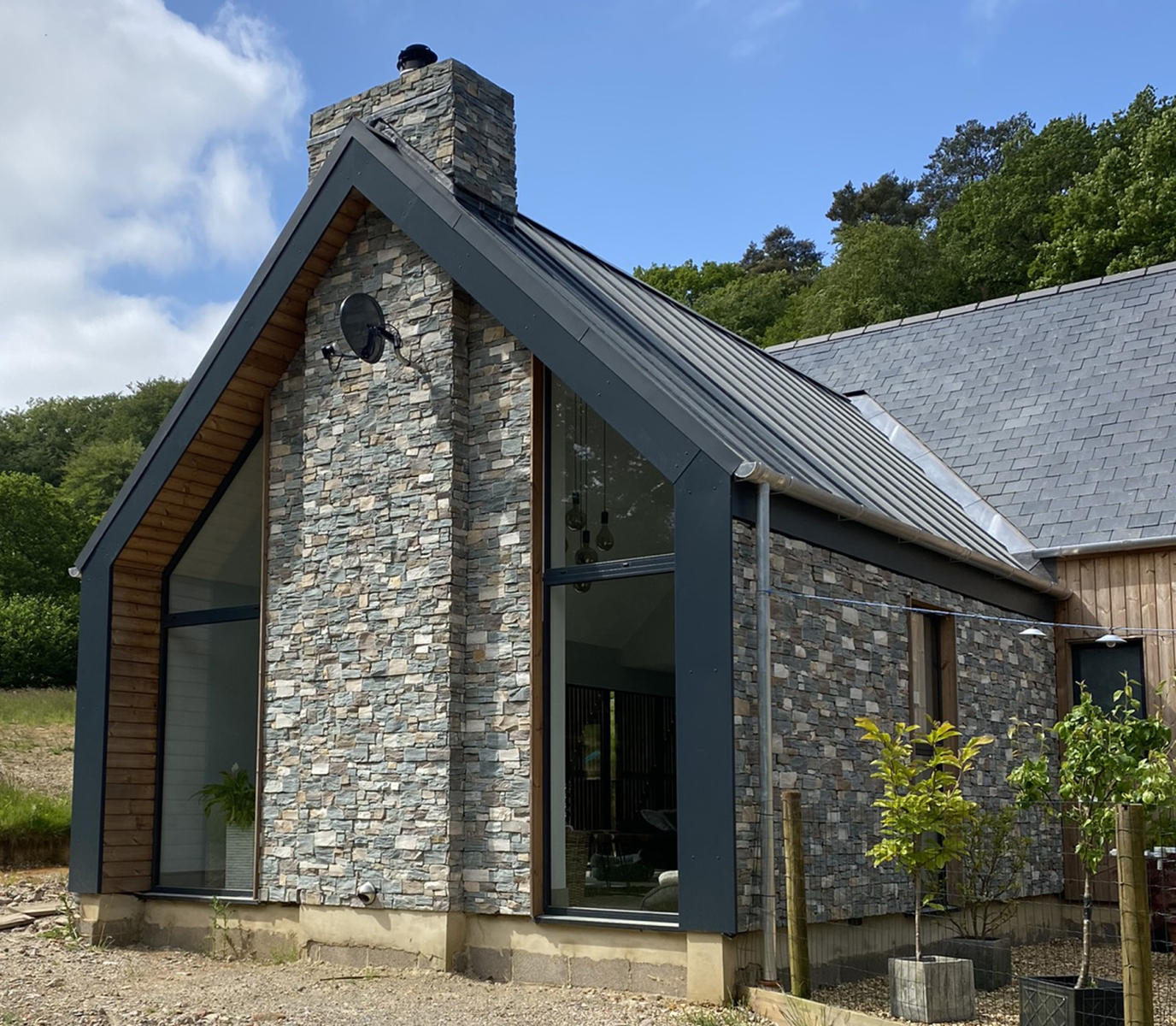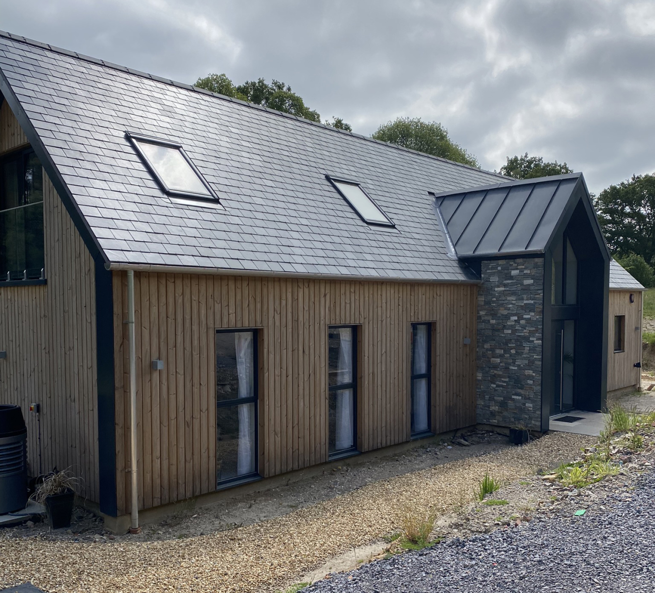 The client’s initial brief was for the new home to have the simple built-form, reminiscent of traditional gable-end and rectangular agricultural barn structures with lower eaves, but with a contemporary aesthetic overall externally and internally. Materials were to be a mix of simple timber cladding and stonework with slate and standing seam metal roofing. The finalised design is for a U-shaped building creating a sheltered courtyard to the rear, looking out over the sloping site and woodland beyond. The wings of the U-shape are single storey and contain the main living space and principal bedroom; both of which are vaulted to give large windows and to take advantage of the simple construction nature of a SIPs build. The building form is expressed on the ends of the two storey and single storey wings with aluminium clad panels from ground level and over the edges of the roof. The single storey elements are stone clad with a zinc standing seam roof, the two storey front section of the bulding is timber clad with slate roof.