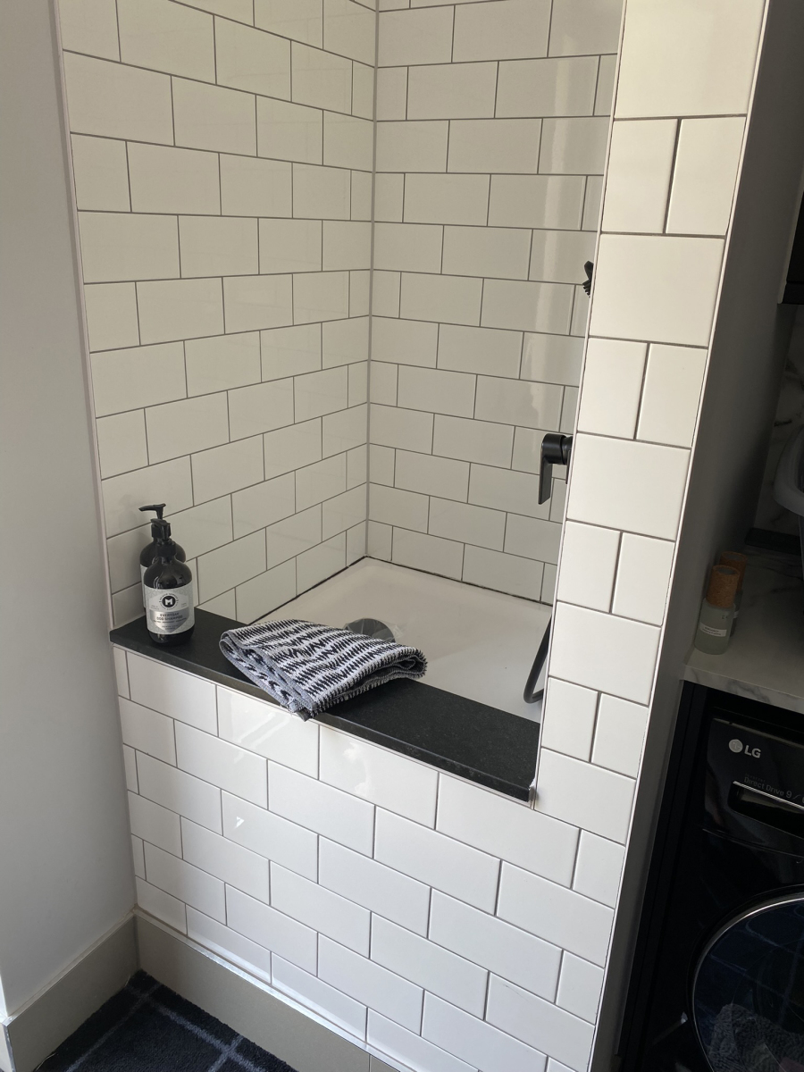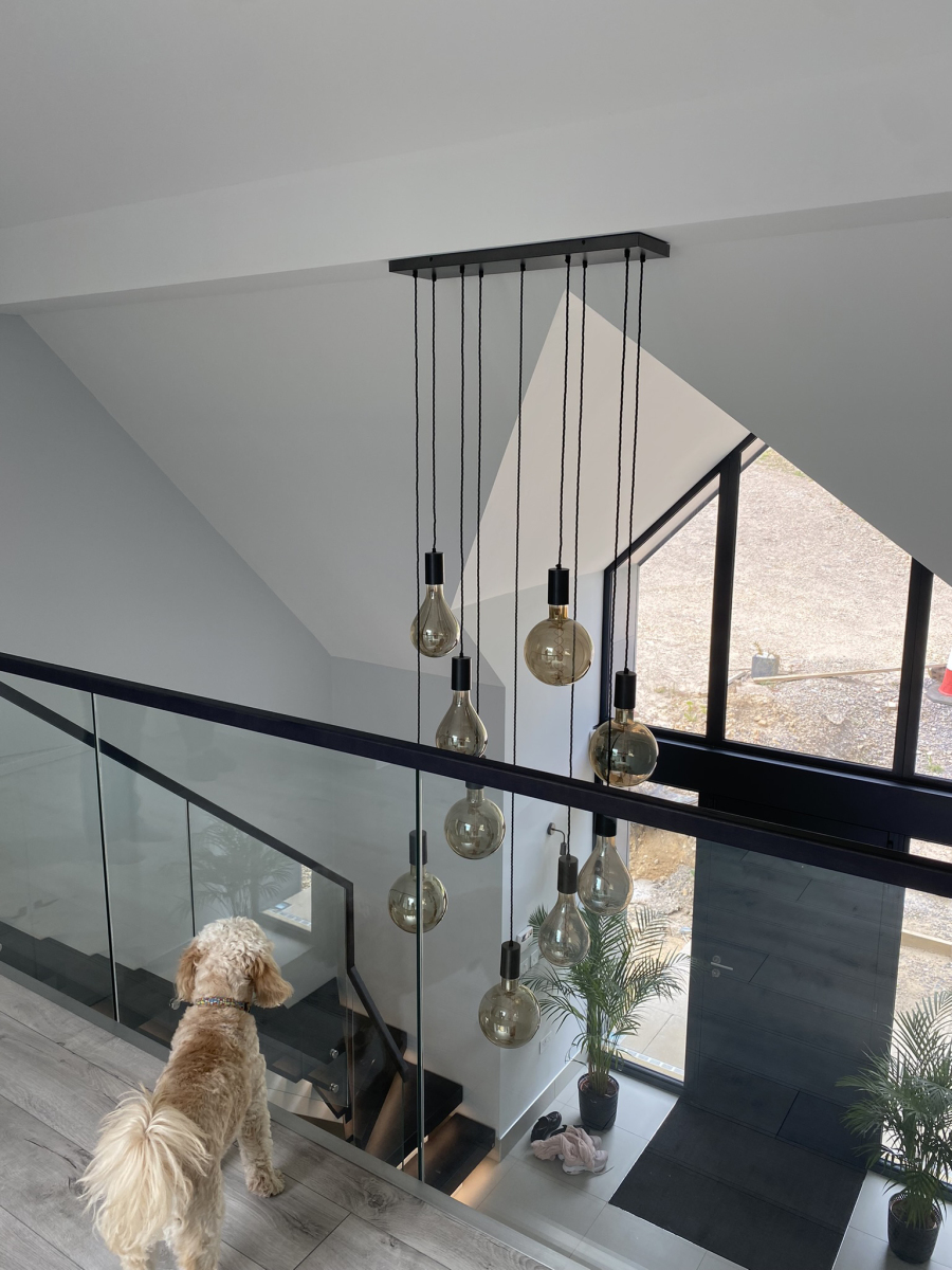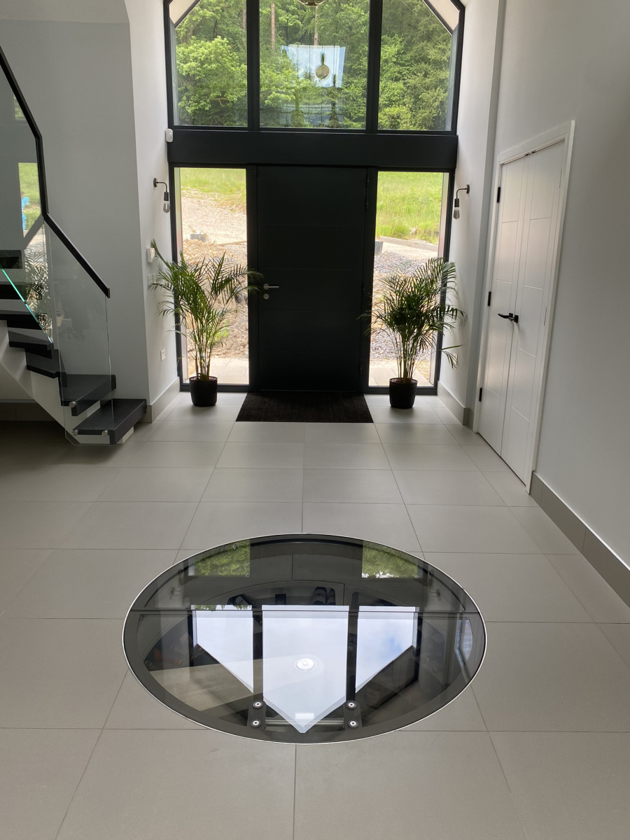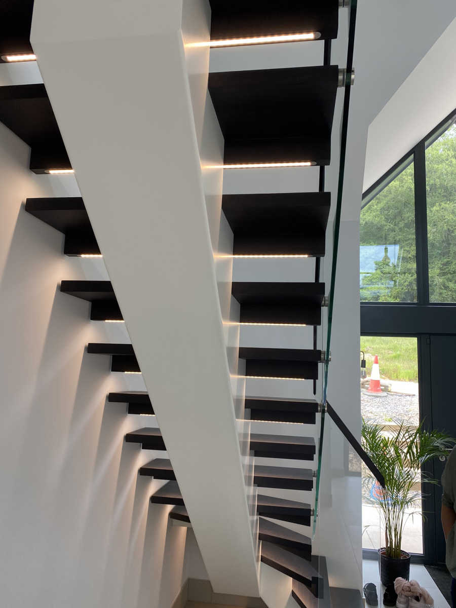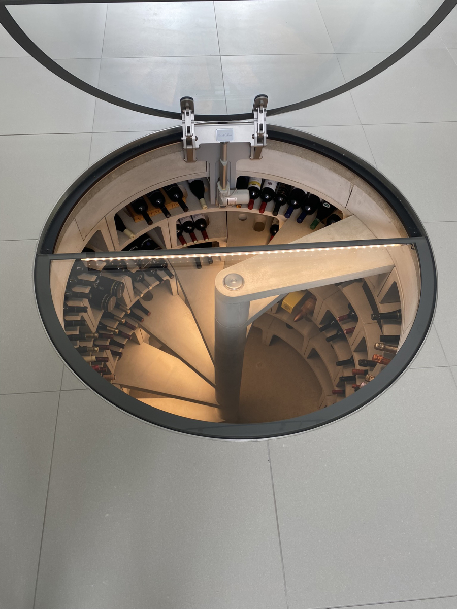 The ground floor contains the principal bedroom, ensuite and dressing room, study, laundry / utility room (complete with dog-shower…), and the open plan kitchen, dining and reception room. A fourth bedroom with ensuite completes the ground floor accommodation. The vaulted entrance hall, with sunked spiral wine-store as a focus and talking point in the centre of the space, leads up to a bridge link between the two first-floor bedrooms and bathrooms. The gable ends of the first-floor bedrooms are completed wih re-entrant balconies, set back from the end of the bulding to give privacy and shading to the glazing.