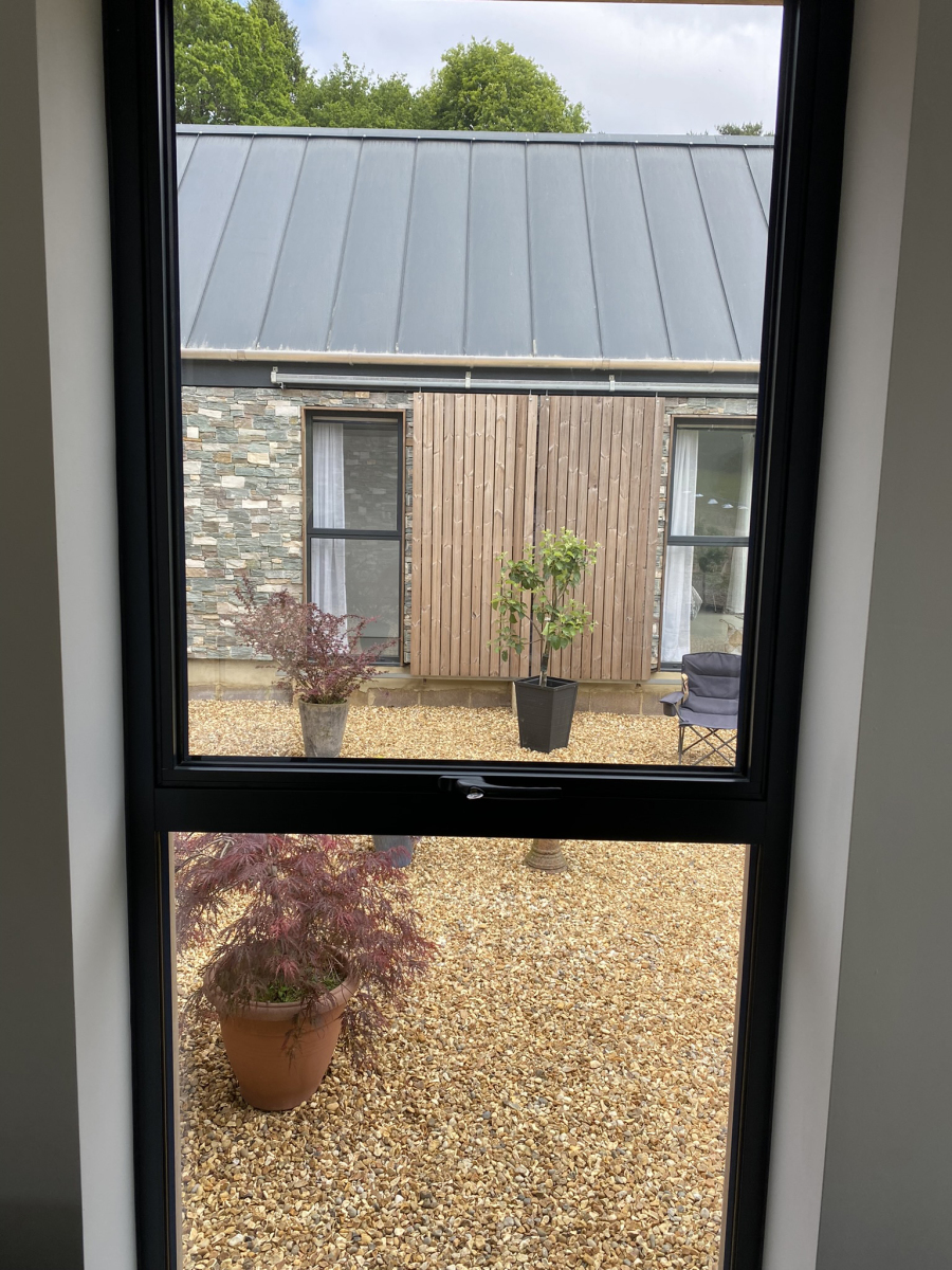 Large glazed openings facing south-west would normally be a concern with their potential for creating internal overheating; the lack of a cantilevered roof structure prevents deep eaves shading the windows. However, in keeping with the agricultural barn appearance, large sliding timber panels have ben designed and included that can be used to close off each of the south-west facing windows in summer on particularly hot days; with the sliding screens closed the doors behind can be opened to maintain a refreshing cross breeze through the building.