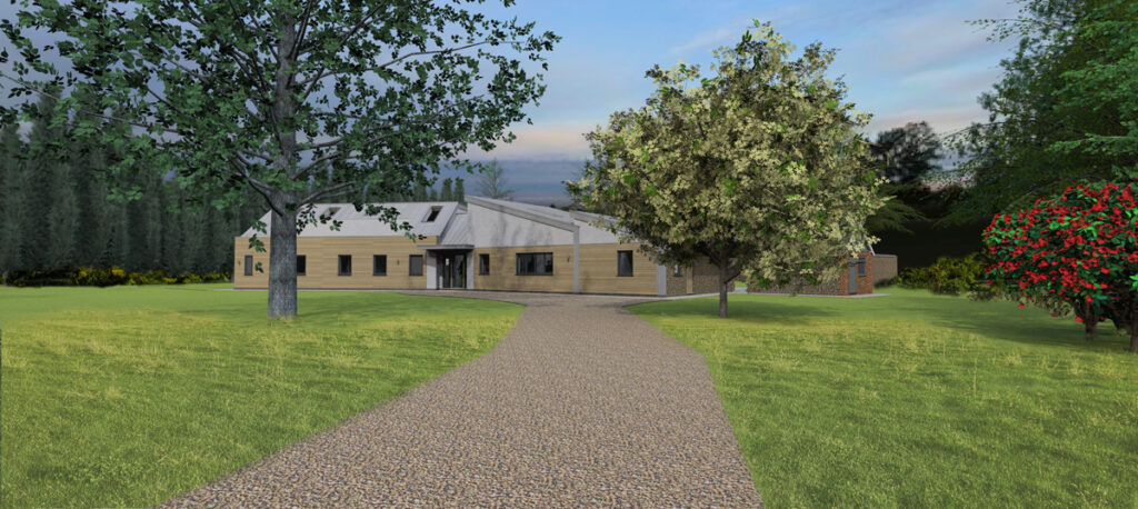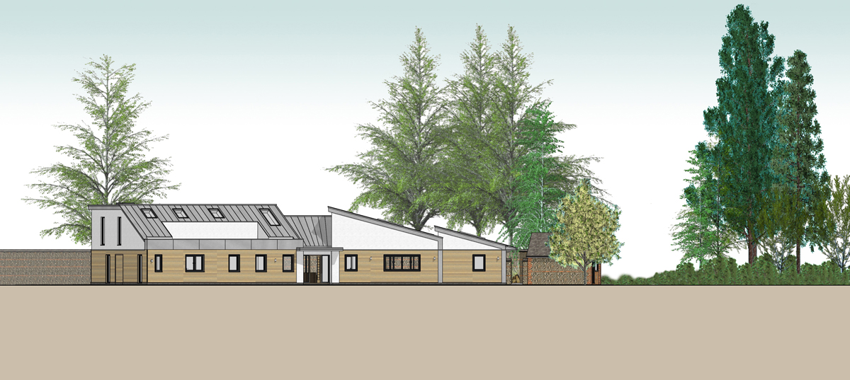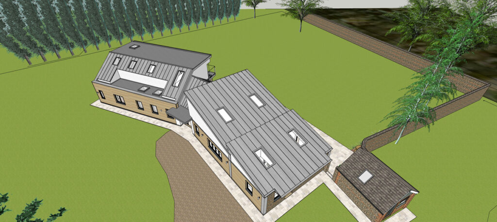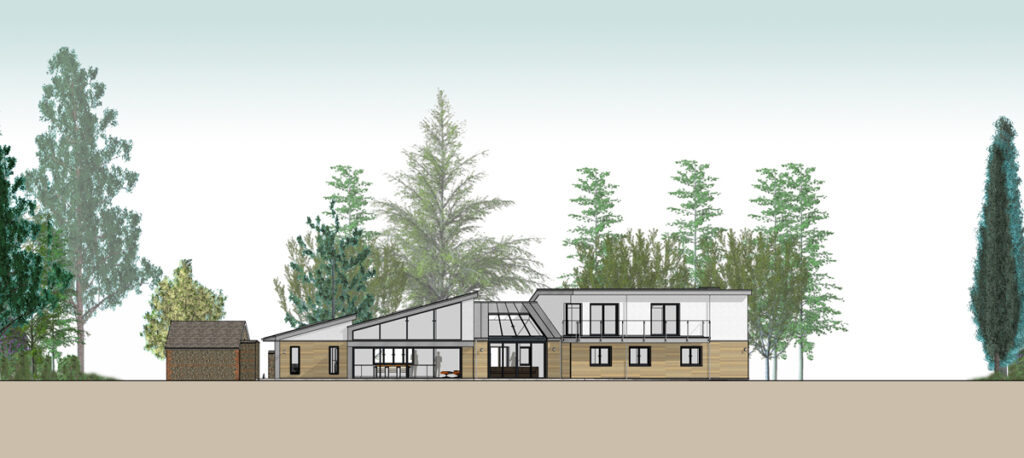 The existing house, sitting right on the side of the access track, was effectively single storey with a small room in the cramped loft space. The replacement dwelling is designed to give the appearance of a single storey dwelling through the roof forms and materials yet the ‘bedroom wing’ is a full two storey element giving an increase in the overall height of just 0.6m.