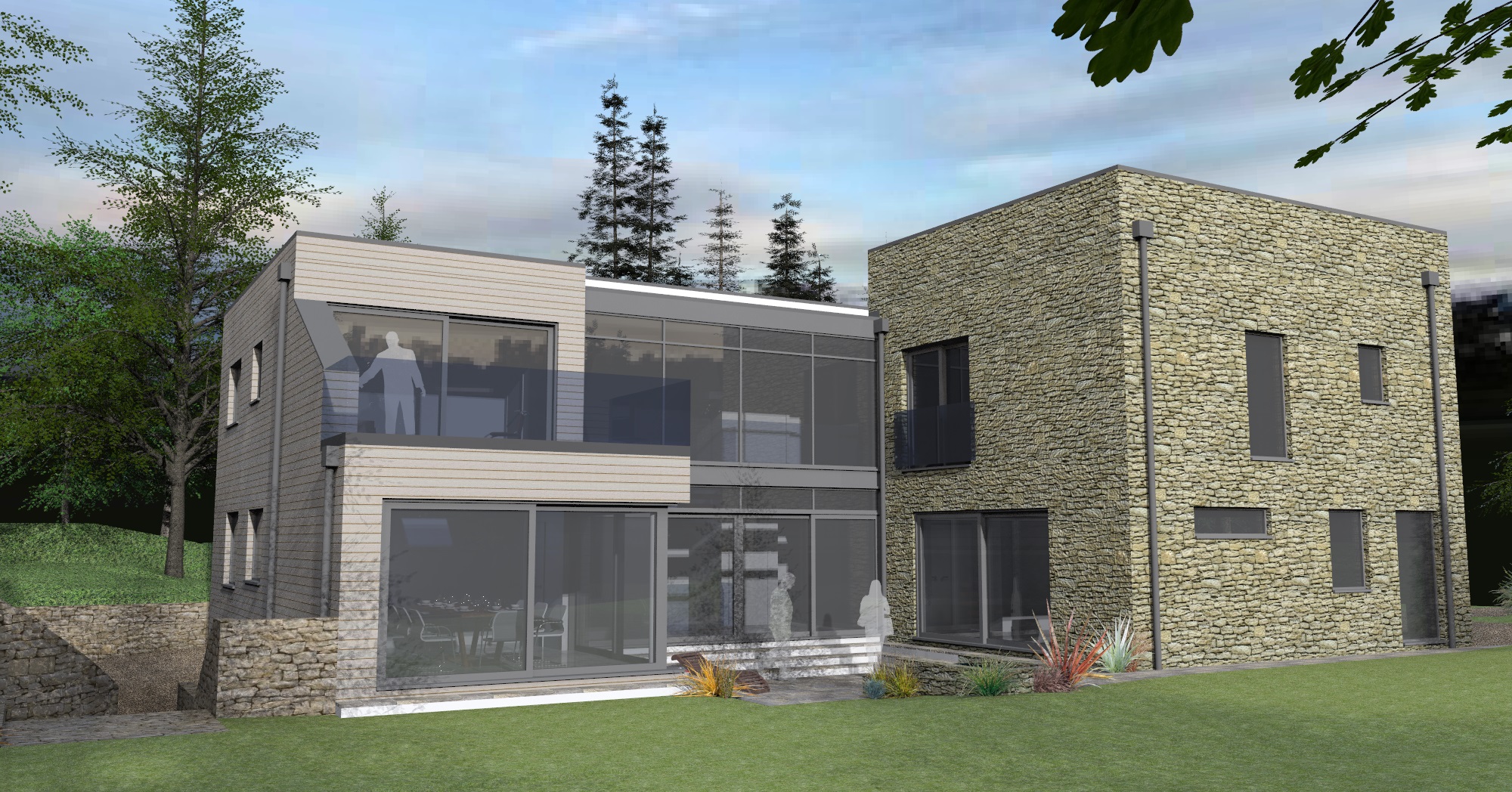 The contemporary design is based around the concept of three separate blocks; one rendered, one timber clad and one a stone block. These blocks are separated and linked with a central glazed double height entrance hall opening on to the sunken rear terrace facing the west garden.