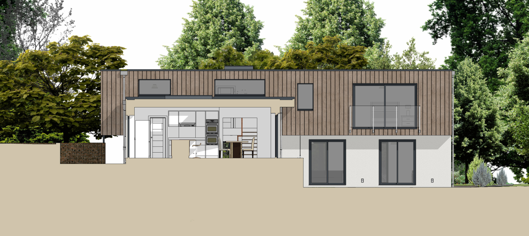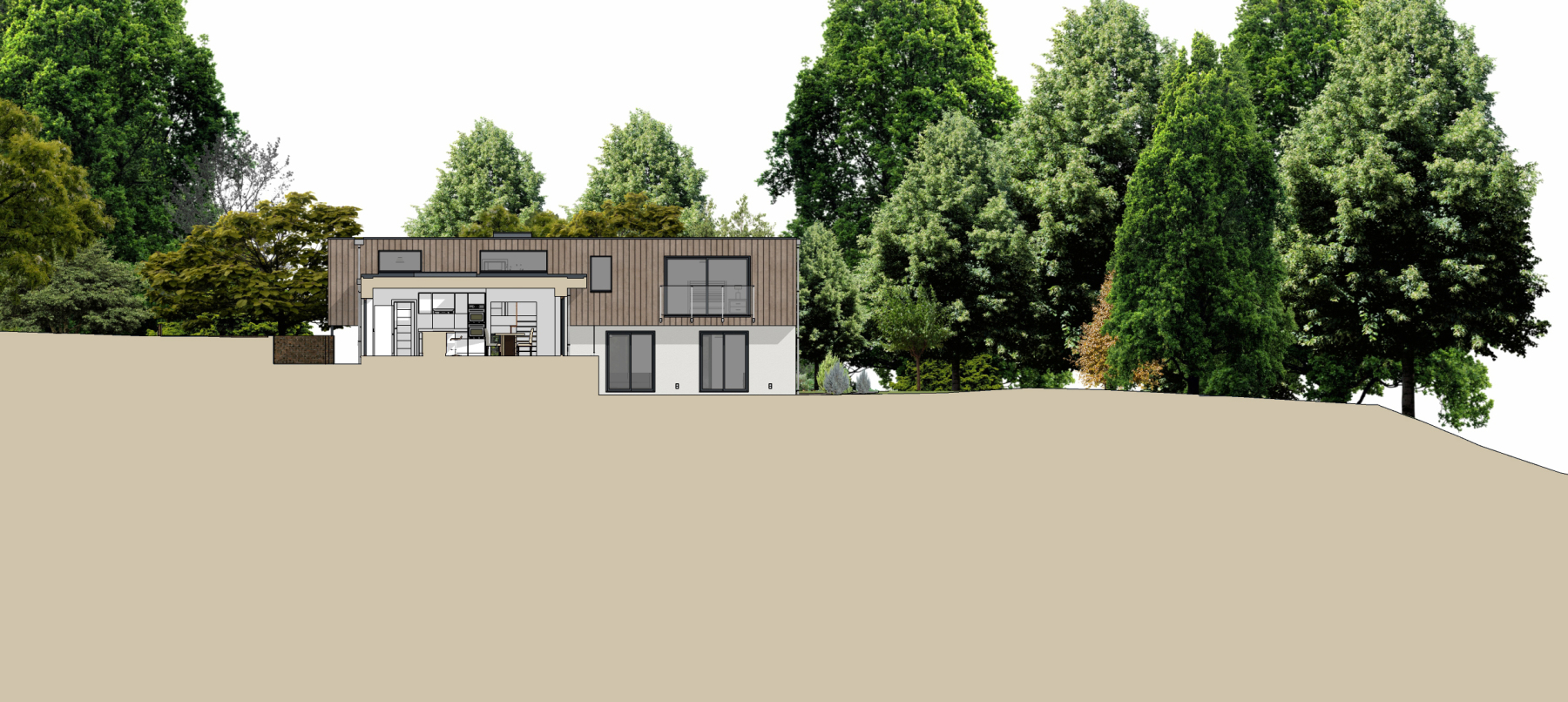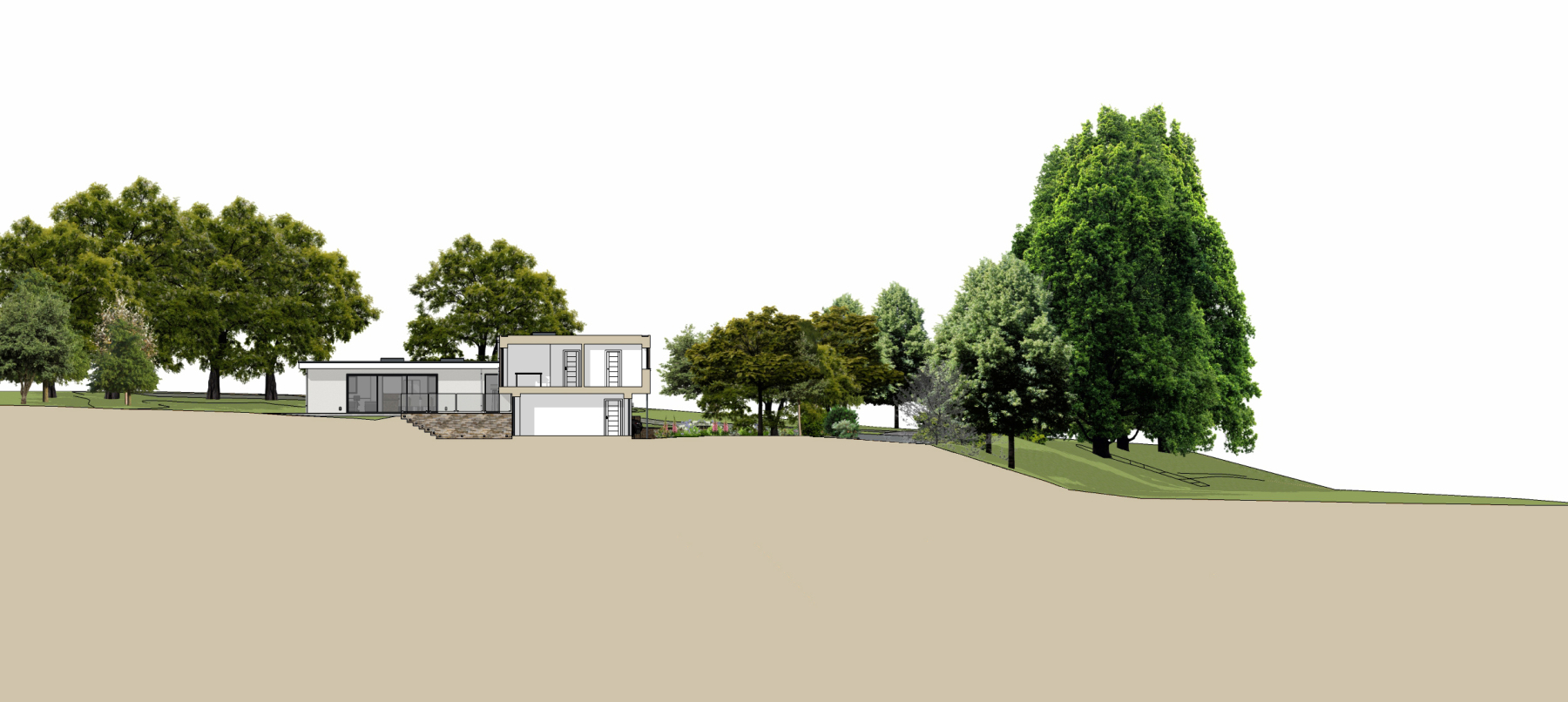 The flat roof design ensured that the overall height of the new building was only 0.5m higher than the ridge line of the existing house and the L-shaped plan allowed the frontage of the existing buildings to be reduced from 25m to 17m for the replacement building; all of which ensured that the planners agreed that the proposals would not appear more intrusive in the AONB landscape.