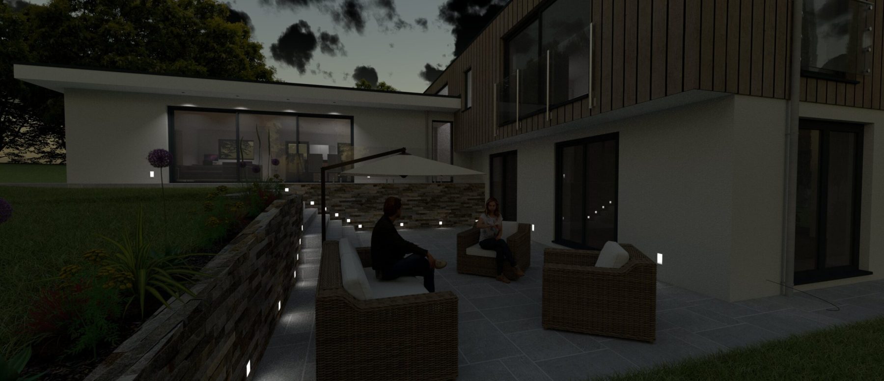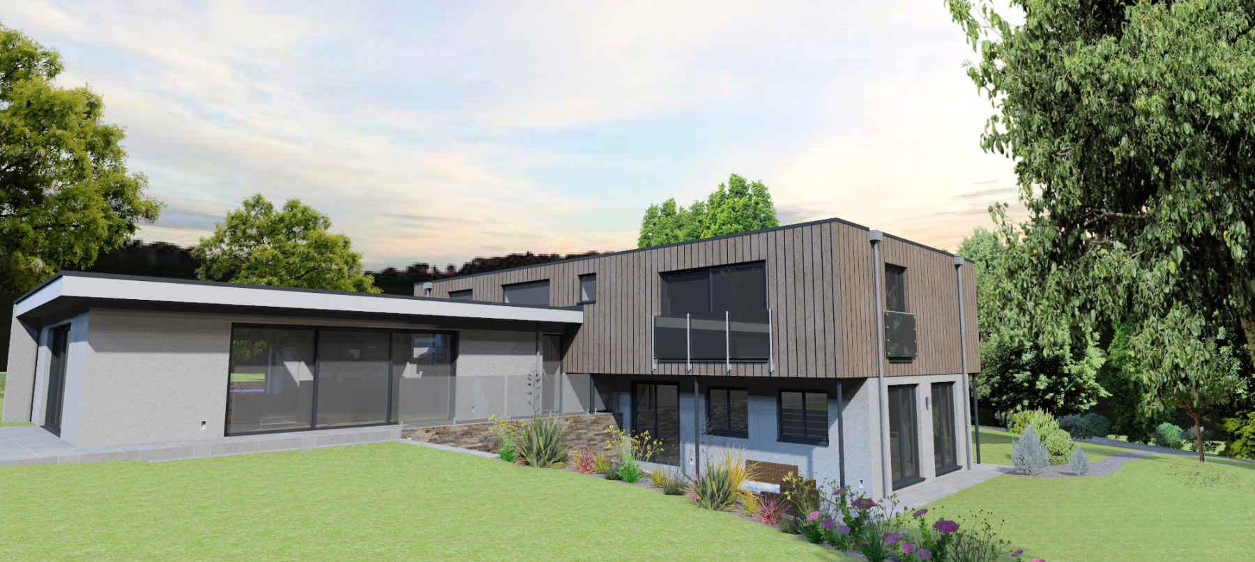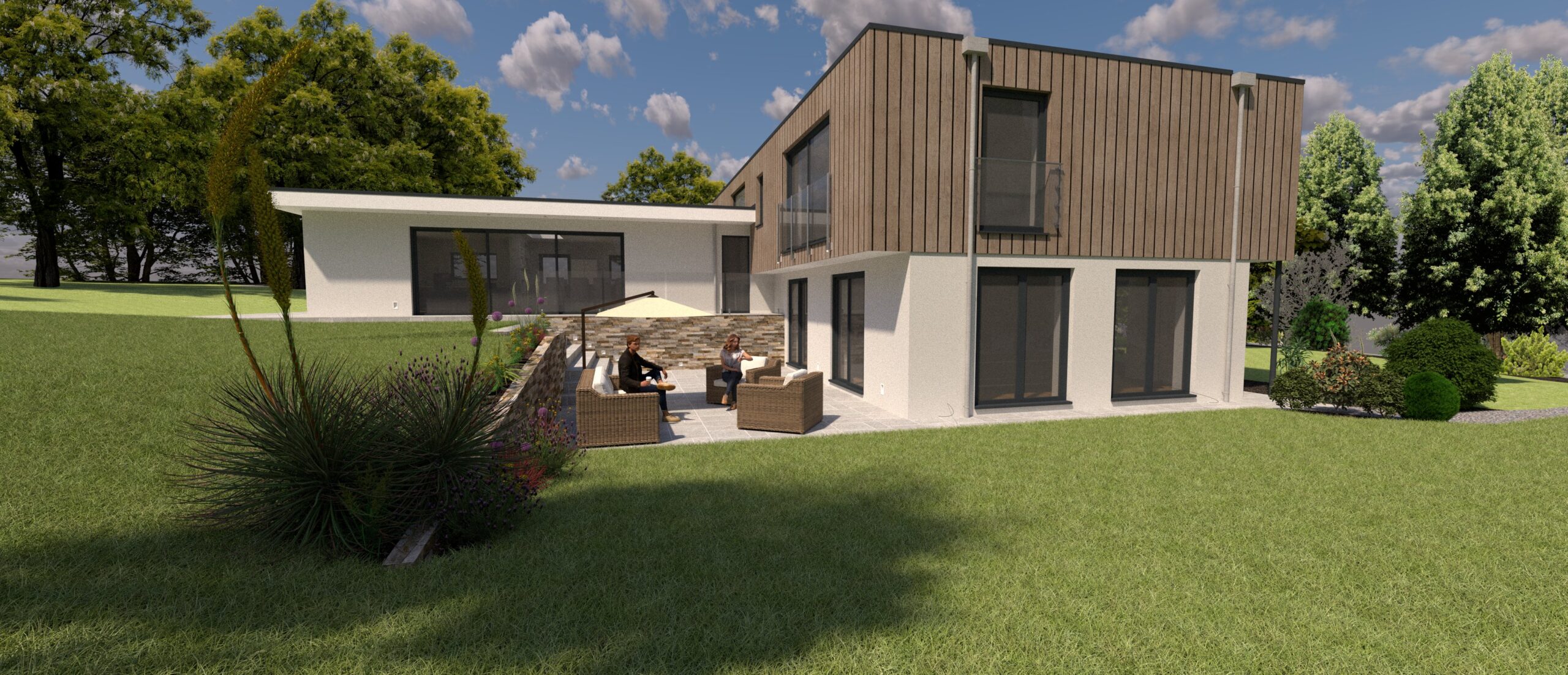 The flat roof design ensured that the overall height of the new building was only 0.5m higher than the ridge line of the existing house and the L-shaped plan allowed the frontage of the existing buildings to be reduced from 25m to 17m for the replacement building; all of which ensured that the planners agreed that the proposals would not appear more intrusive in the AONB landscape.