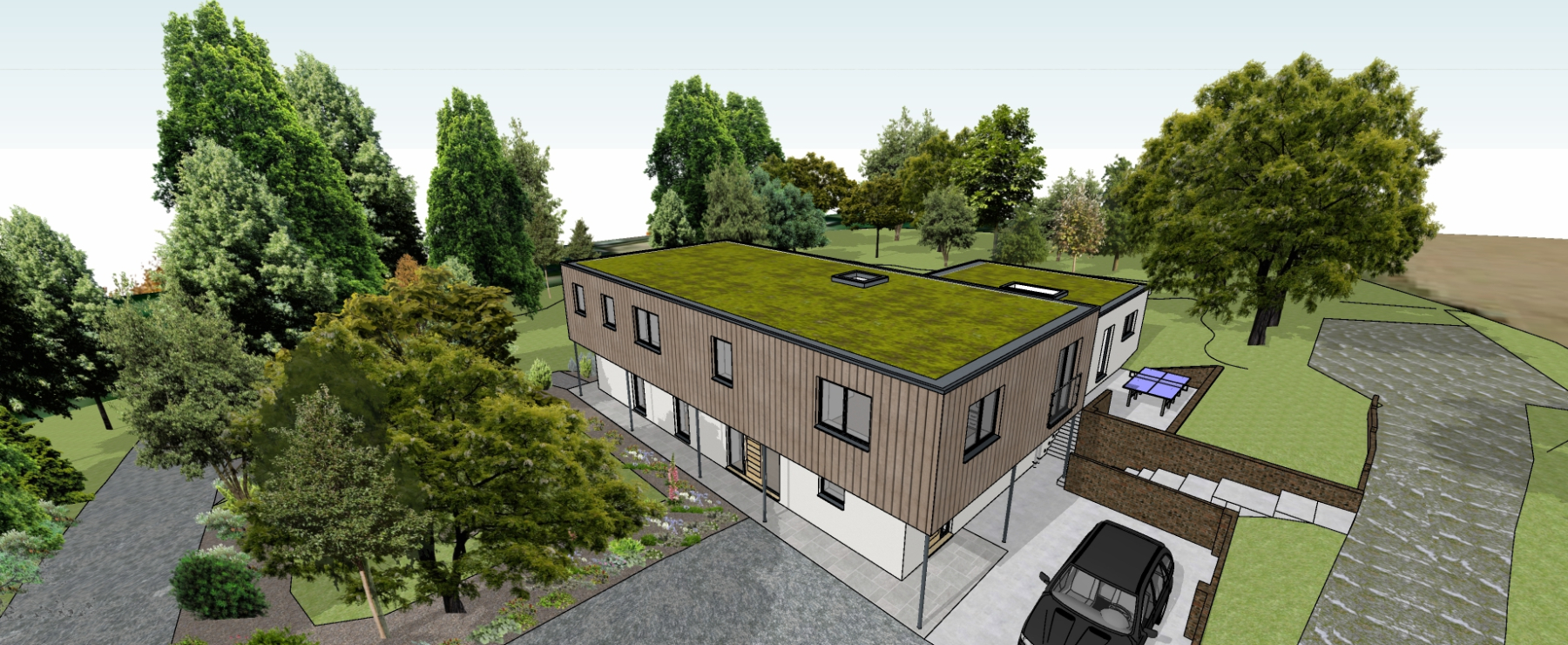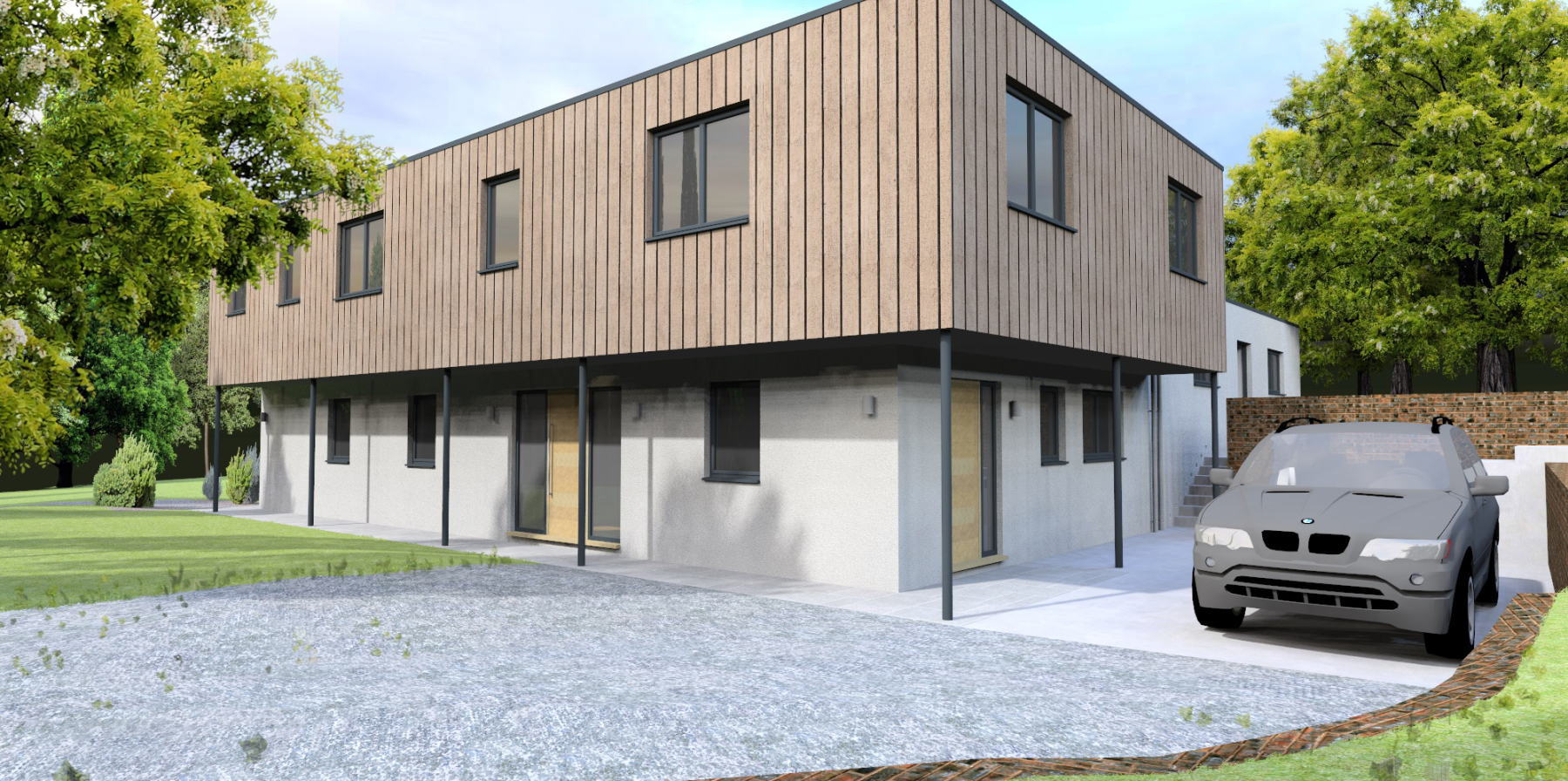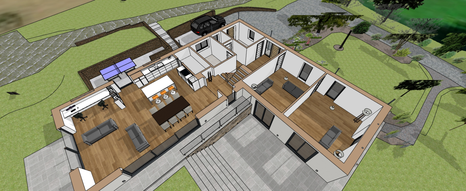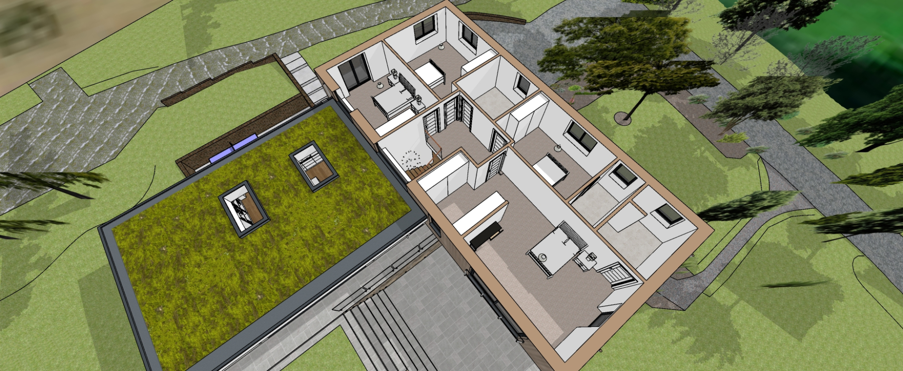 Designed to be built using a well-insulated and lightweight timber frame the overhanging roofs to the south and west elevations provide natural passive solar controls. Whole House Mechanical Ventilation coupled with ground source heat pumps ensured that the scheme surpassed the requirements of Building Regulations for energy efficiency. Detailed 3D modelling and assessments of the roof overhangs were carried out with annual sun-hour calculations to the large areas of glazing checked using the geosynchronised 3D model.
