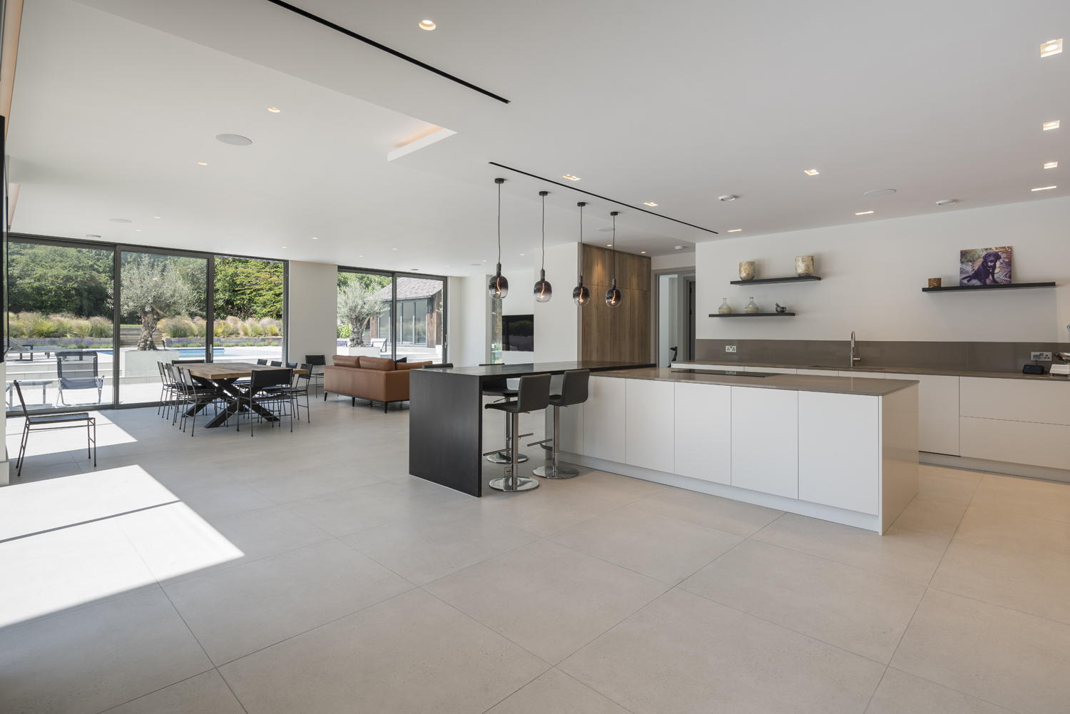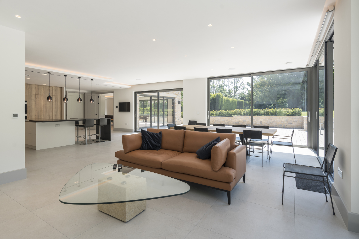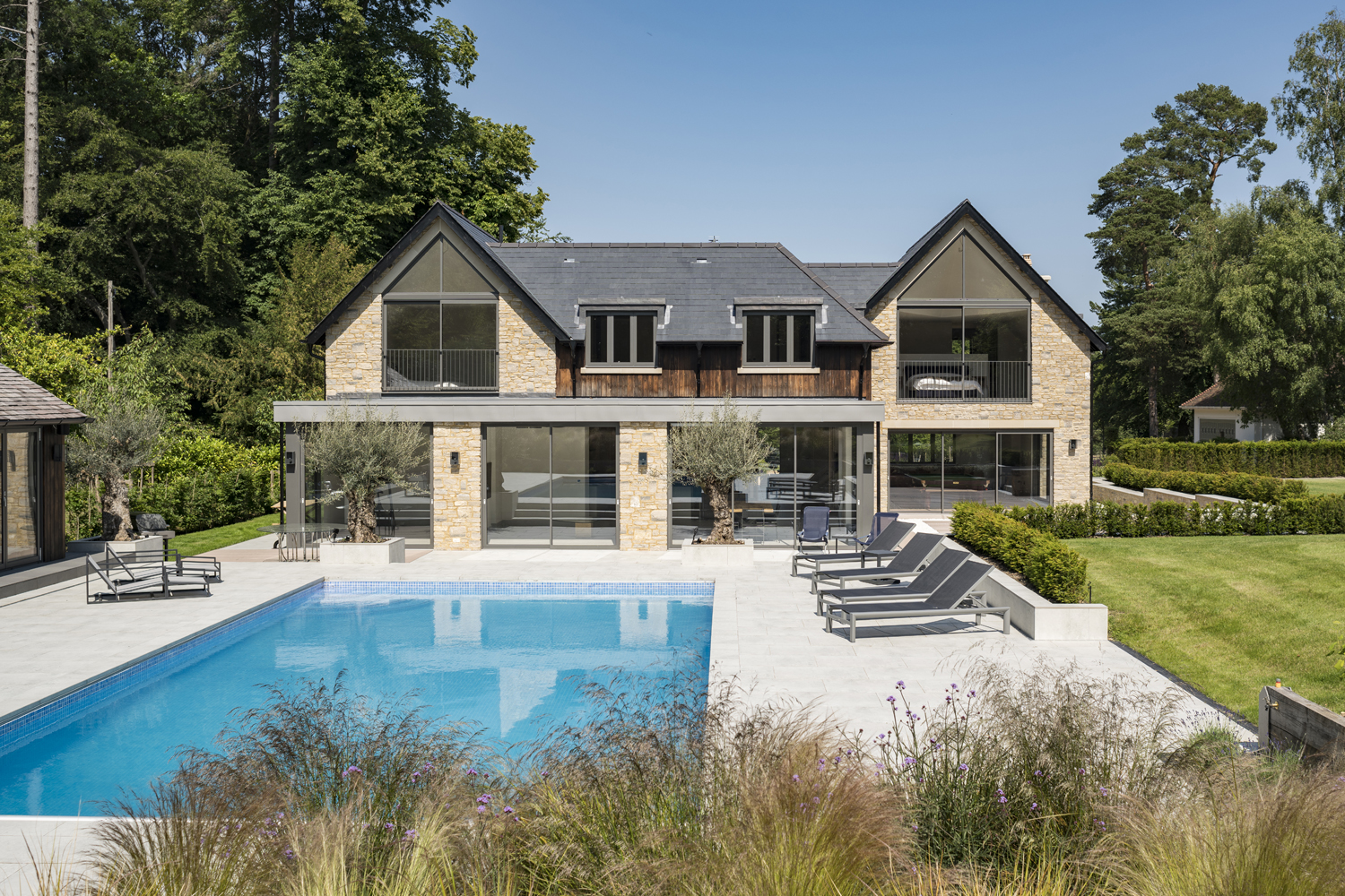 Large windows and sliding doors facing south and west open on the rear gardens, terraces and swimming pool with a contemporary, flat roofed, single storey rear with two vertical panels of matching stone along a fully glazed wall and return panels.