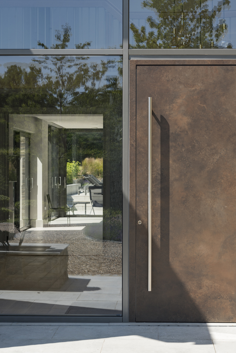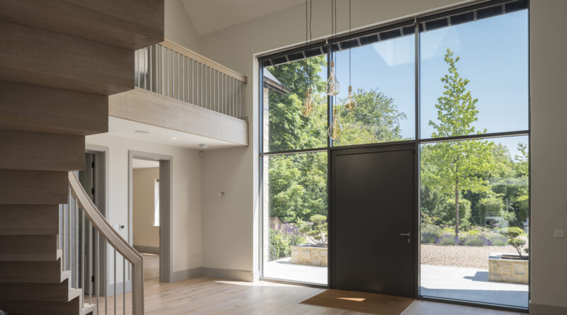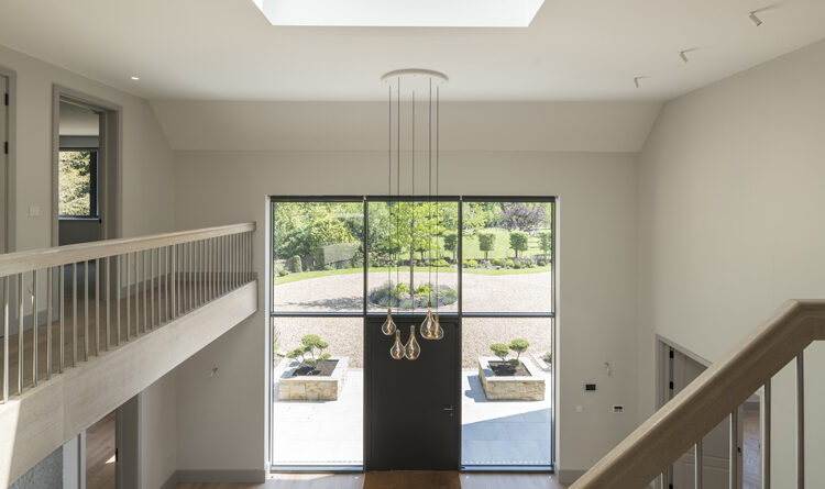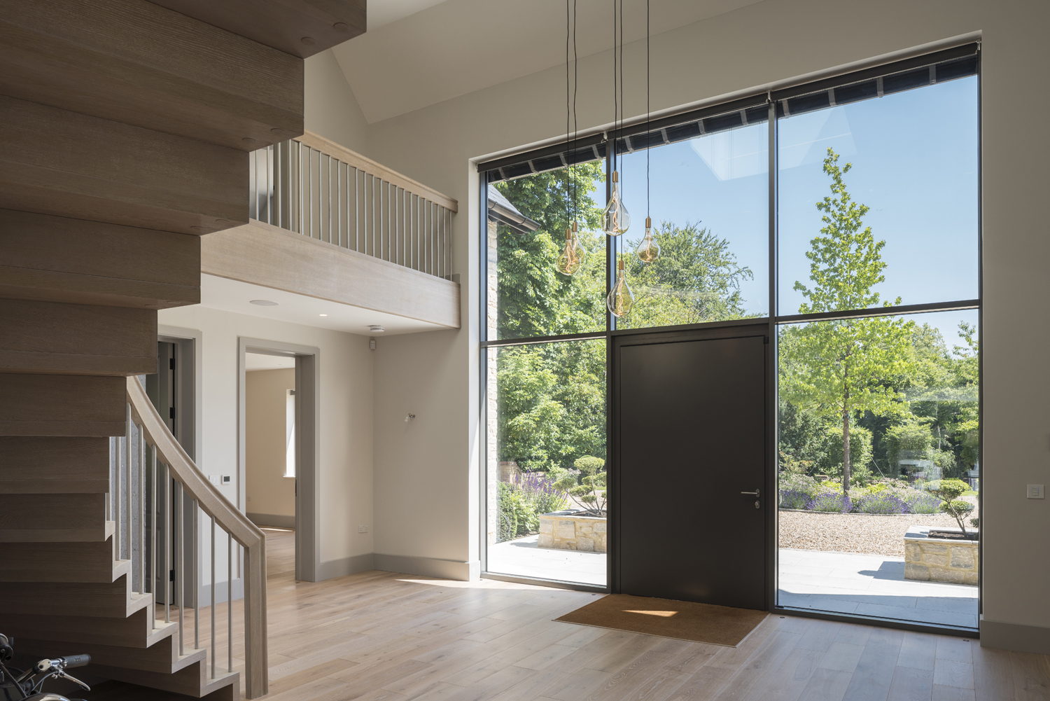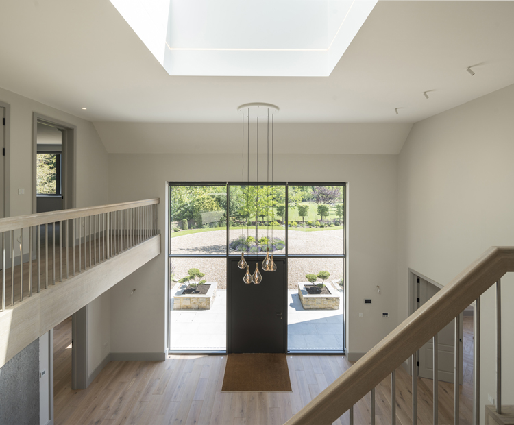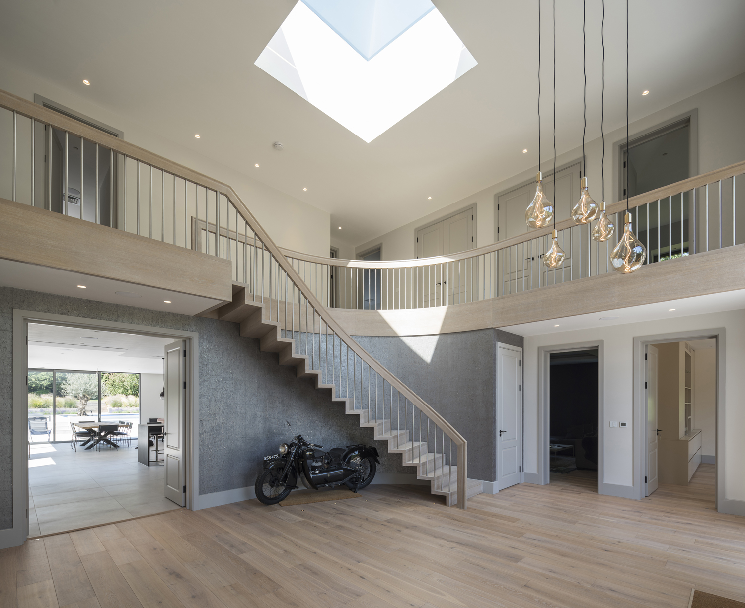 The large footprint with deep plan minimised external walls again and allowed the creation of the large rooms requested by the client. The Entrance Hall benefits from the tall glazed screen with oversized door (measuring almost 2.3m tall by 1.3m wide) and a 4sqm rooflight drops daylight into the heart of the building over the curving staircase.