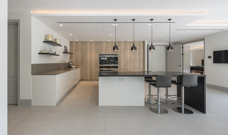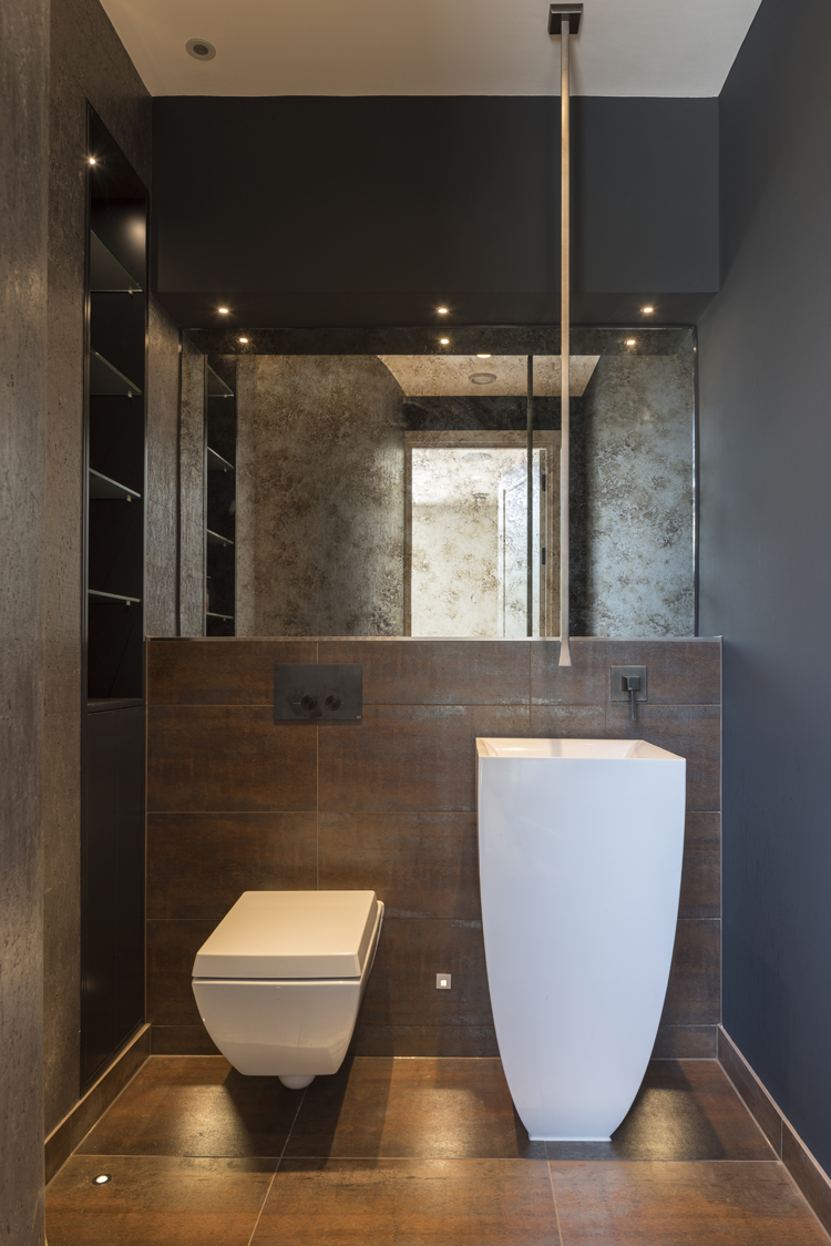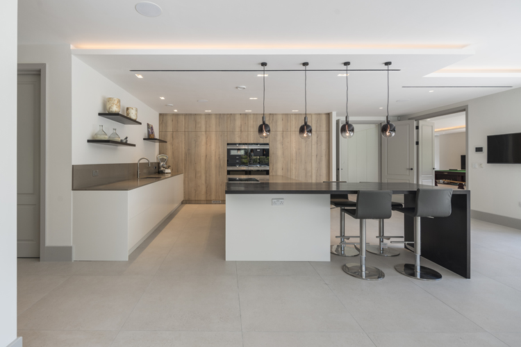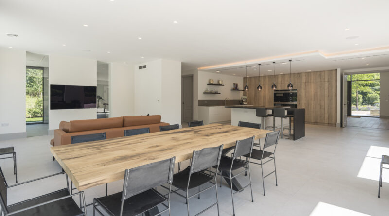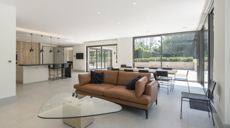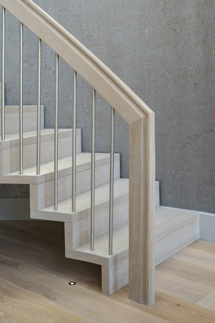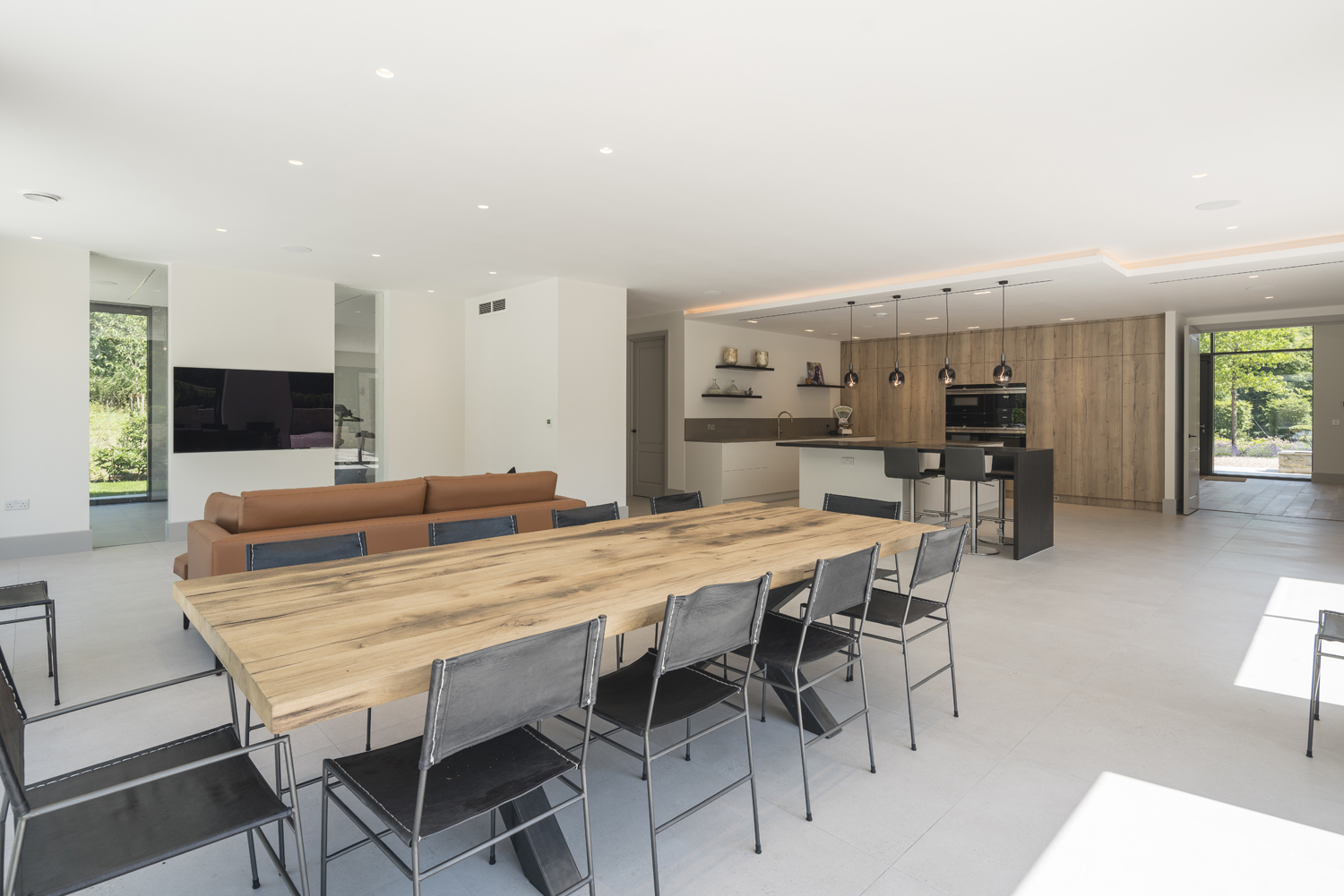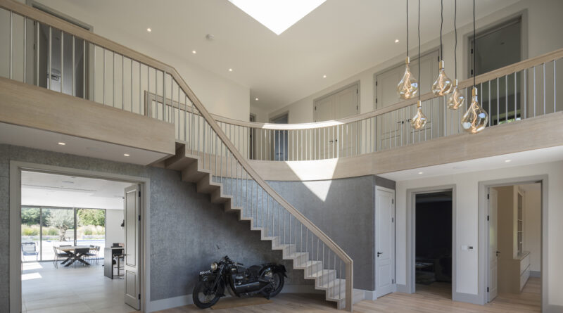 The large footprint with deep plan minimised external walls again and allowed the creation of the large rooms requested by the client. The Entrance Hall benefits from the tall glazed screen with oversized door (measuring almost 2.3m tall by 1.3m wide) and a 4sqm rooflight drops daylight into the heart of the building over the curving staircase.
