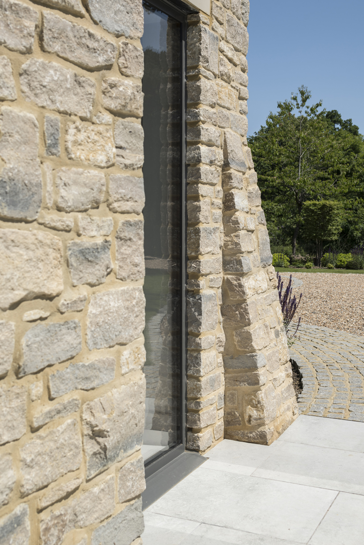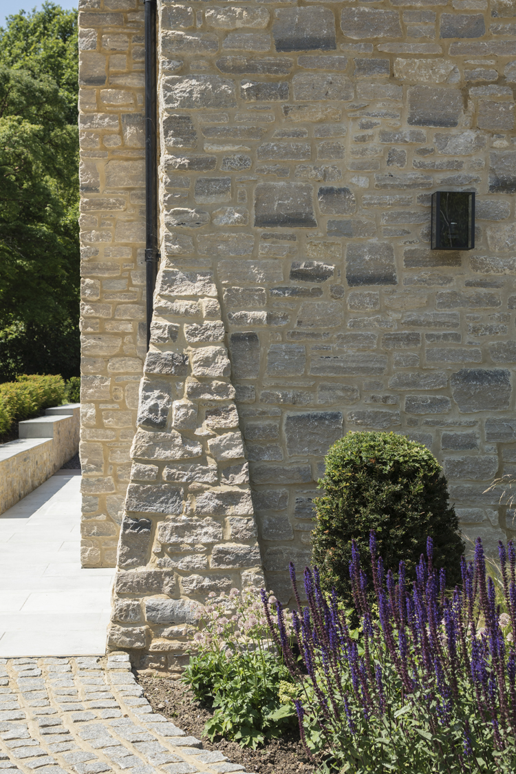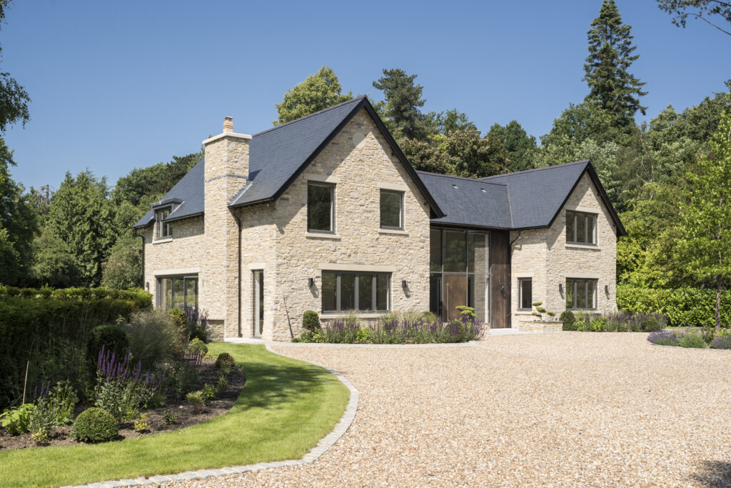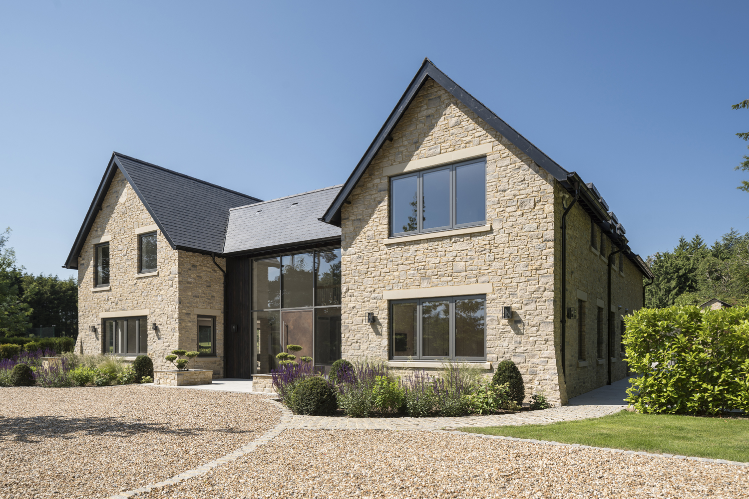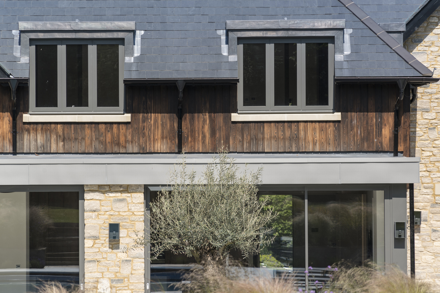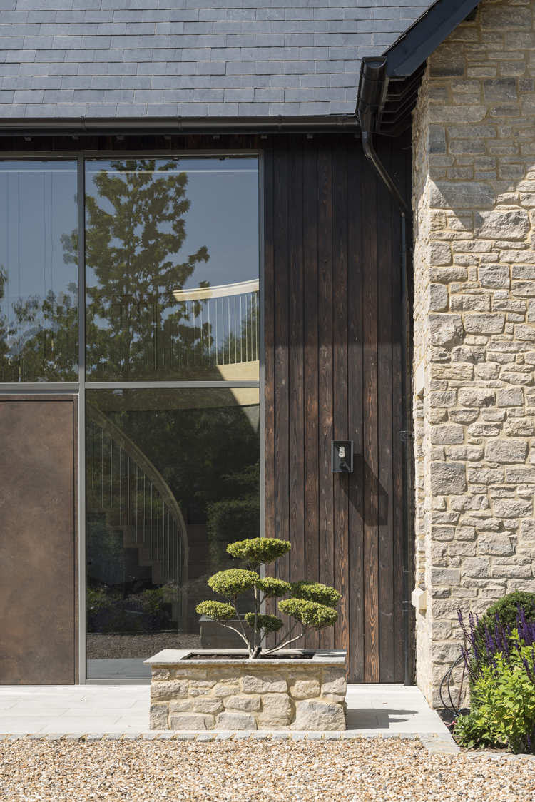External walls built of solid Horsham stone with real stone sills and headers are complimented by fire-blackened larch cladding boards, black painted soffits and fascias and natural slate roofing.