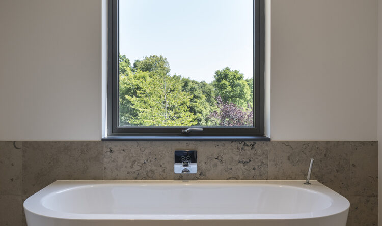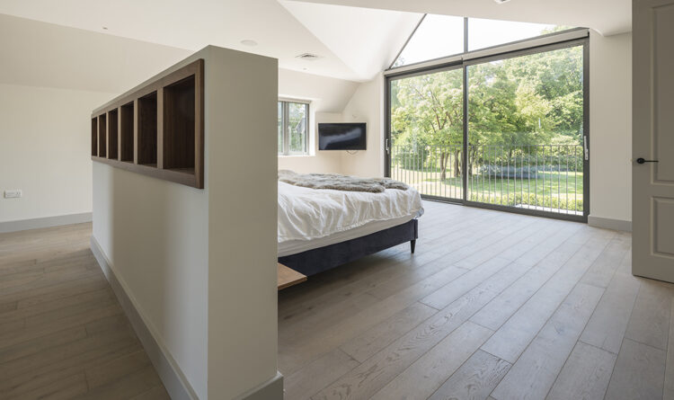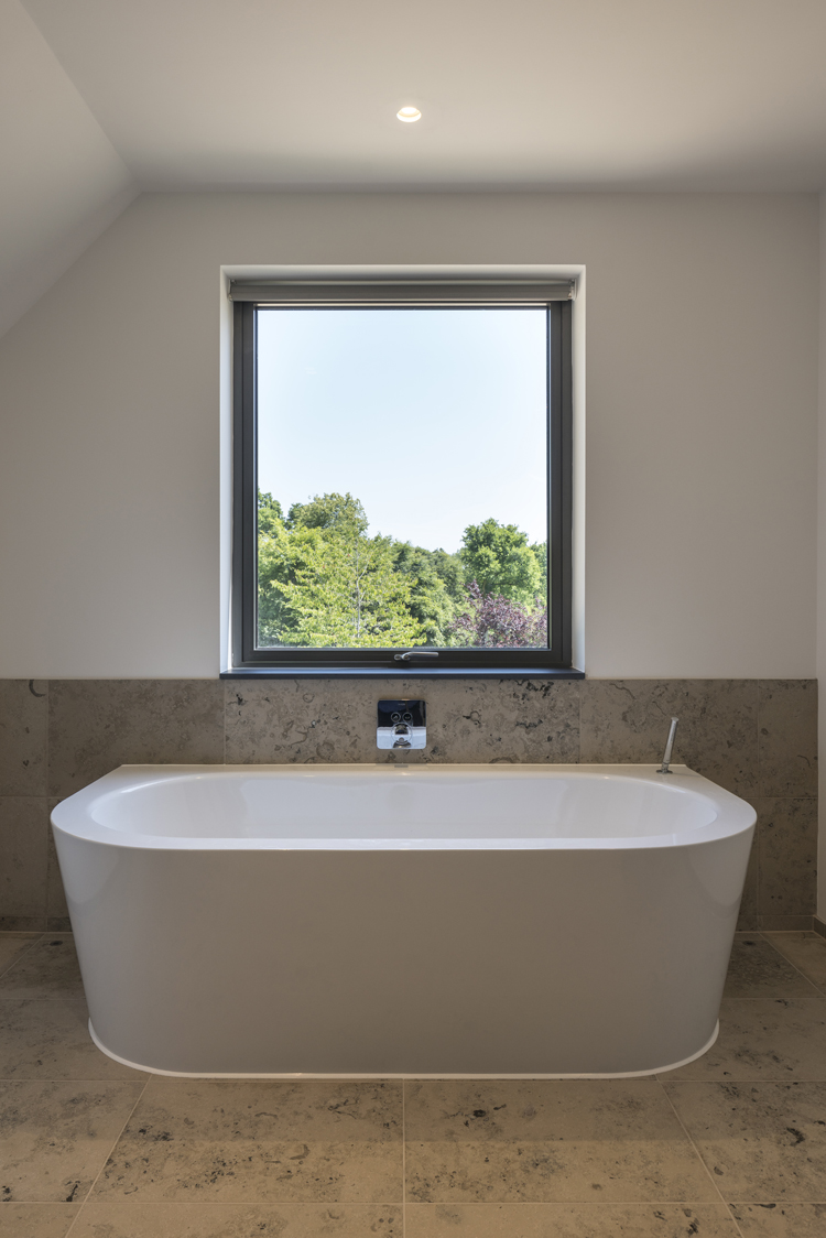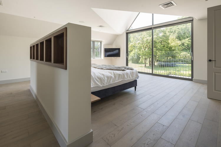To the first floor, the two main bedrooms take advantage of the steeply pitched roof with vaulted ceilings and glazing following the roof line. Dormer window detailing is kept simple and modest with flat lead roofs.